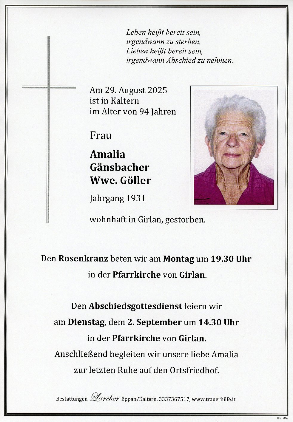 Den Abschiedsgottesdienst feiern wir am Dienstag, 2. September um 14.30 Uhr in der Pfarrkirche von Girlan. Anschließend begleiten wir unsere liebe Verstorbene auf den Ortsfriedhof.
