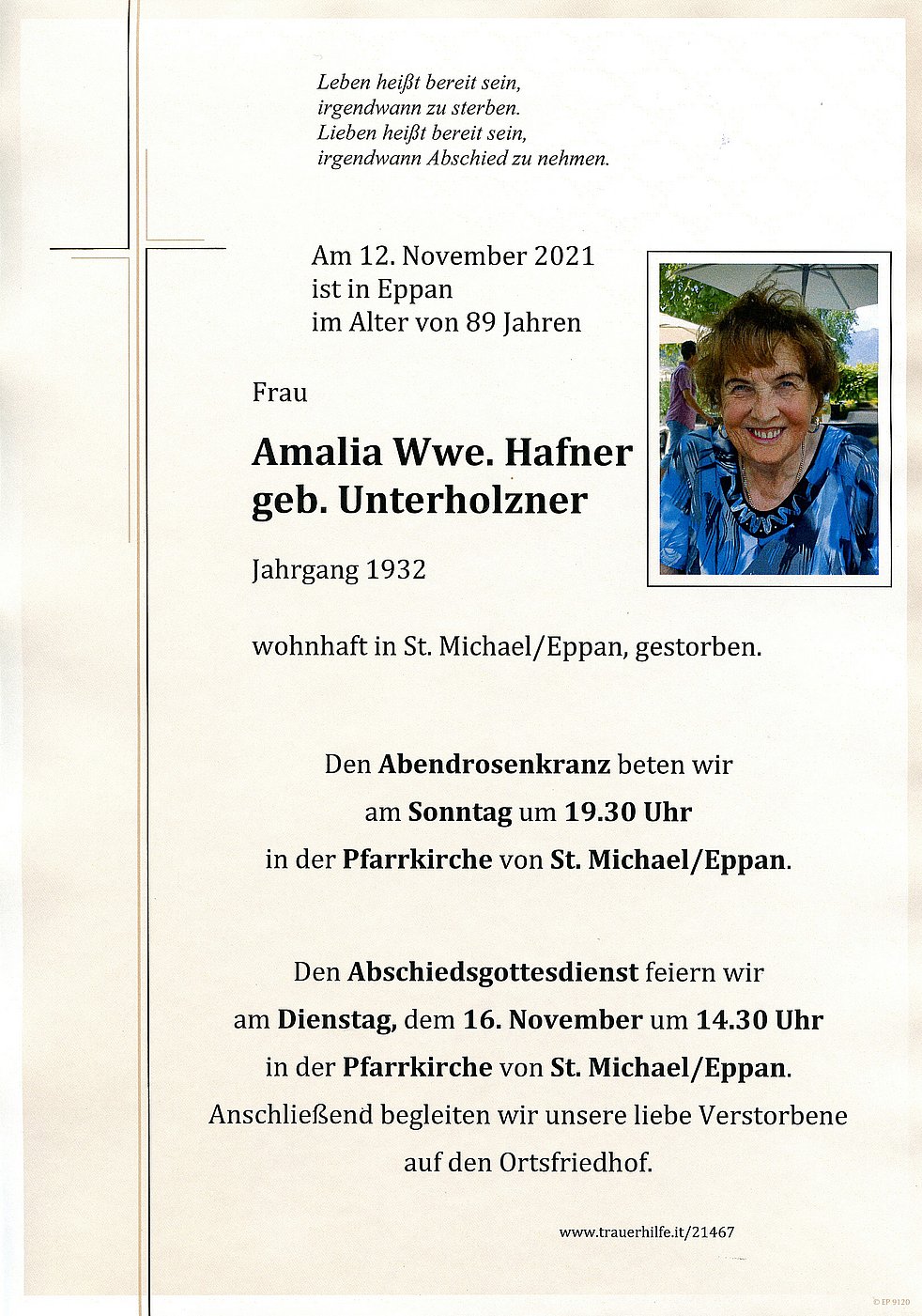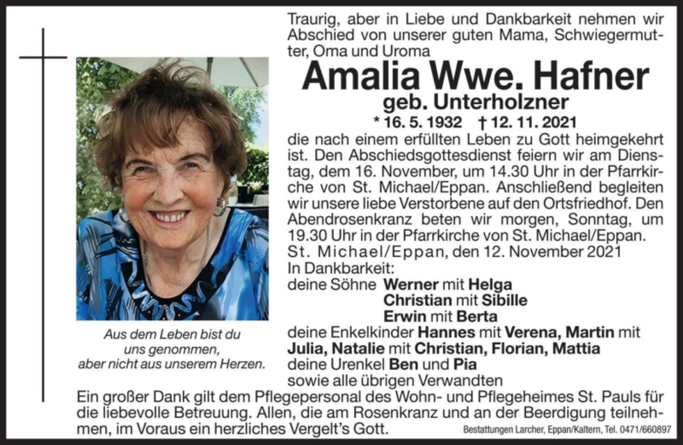Den Abschiedsgottesdienst feiern wir am Dienstag, dem 16. November um 14.30 Uhr in der Pfarrkirche von St. Michael/Eppan. Anschließend begleiten wir unsere liebe Verstorbene auf den Ortsfriedhof.