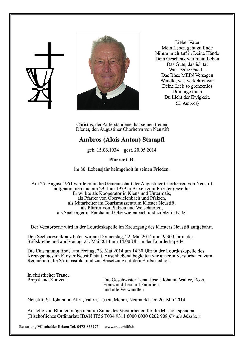 Die Einsegnung findet am Freitag, 23. Mai 2014 um 14.30 Uhr in der Lourdeskapelle des Kreuzganges im Kloster Neustift statt. Anschließend begleiten wir unseren Verstorbenen zum Requiem in die Stiftsbasilika und zur Beisetzung auf dem Stiftsfriedhof.