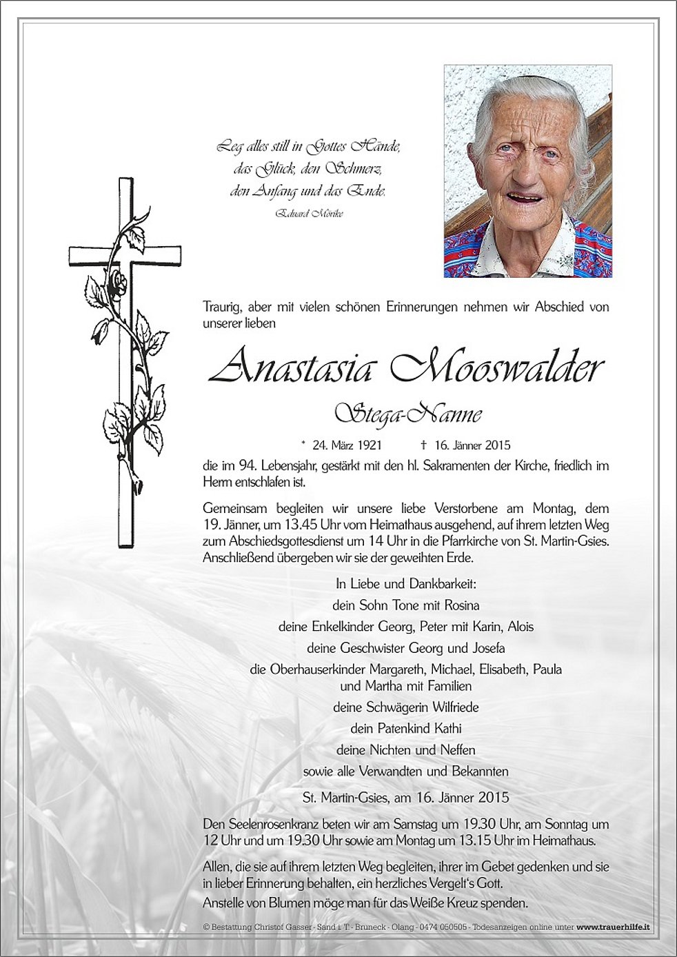 19. Jänner, um 13.45 Uhr vom Heimathaus ausgehend, auf ihrem letzten Weg zum Abschiedsgottesdienst um 14 Uhr in die Pfarrkirche von St. Martin-Gsies. Anschließend übergeben wir sie der geweihten Erde.