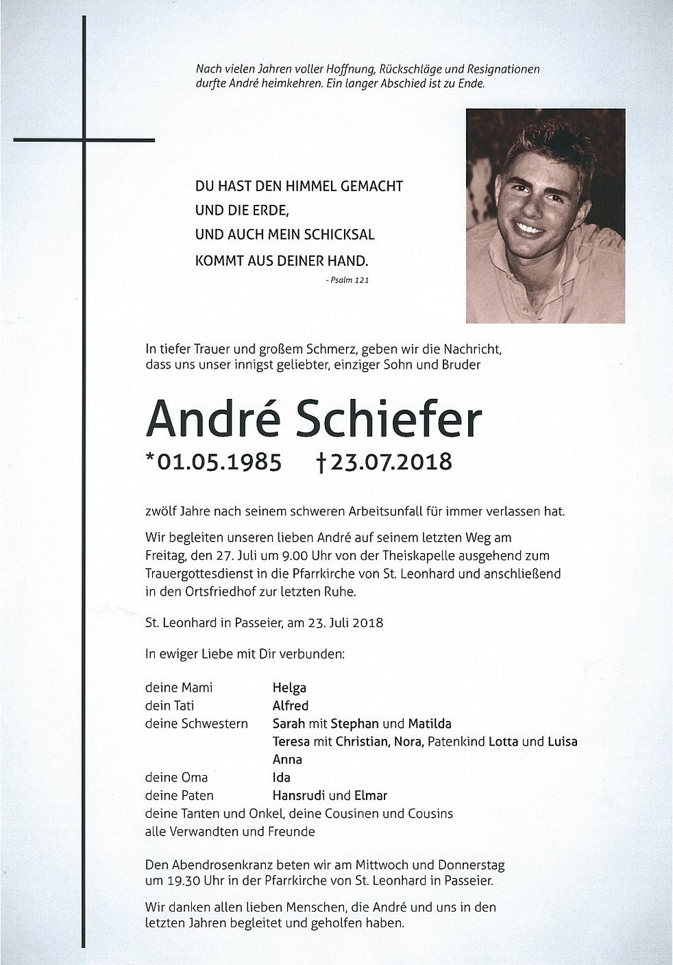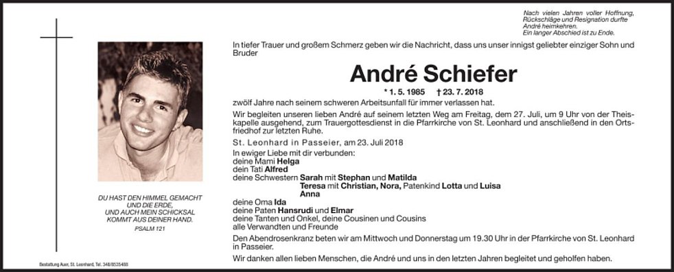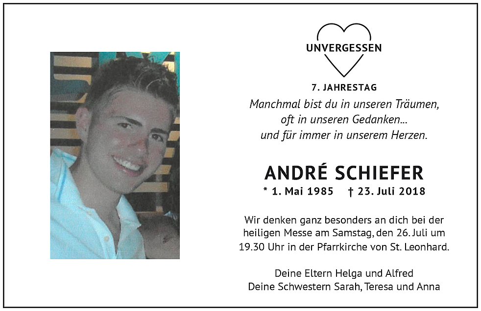 Wir begleiten unseren lieben André auf seinem letzten Weg am Freitag, den 27. Juli um 9.00 Uhr von der Theiskapelle ausgehend zum Trauergottesdienst in die Pfarrkirche von St. Leonhard und anschließend in den Ortsfriedhof zur letzten Ruhe.