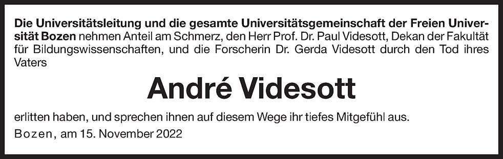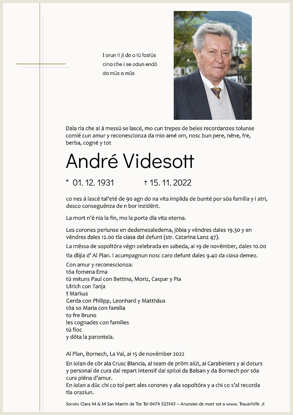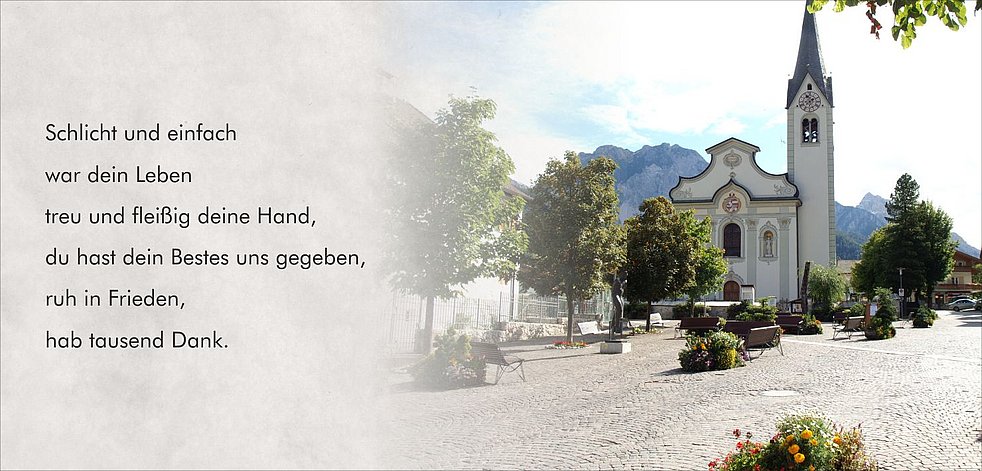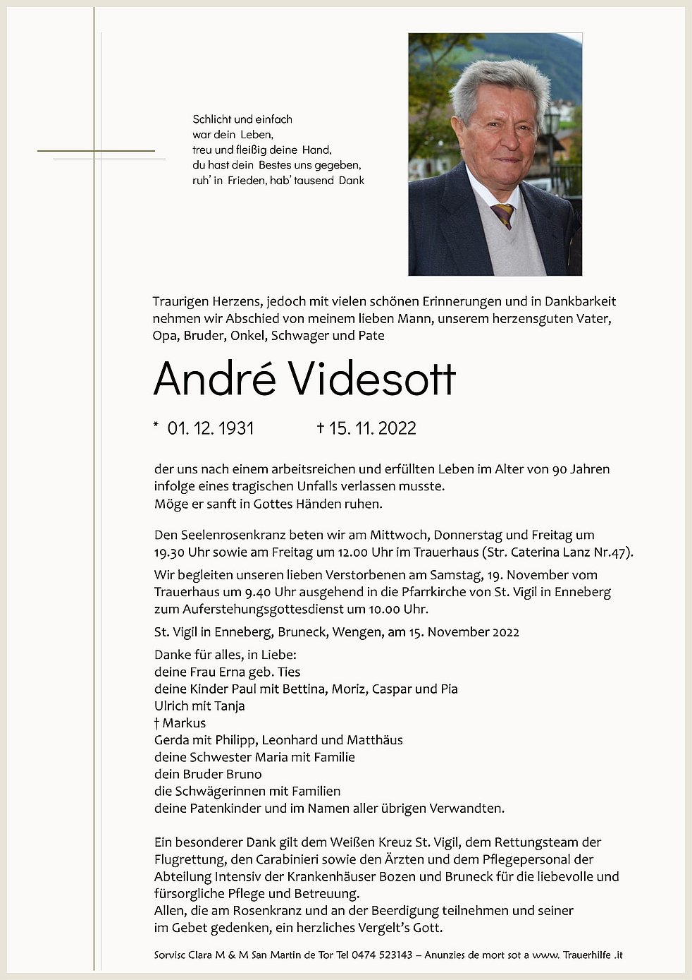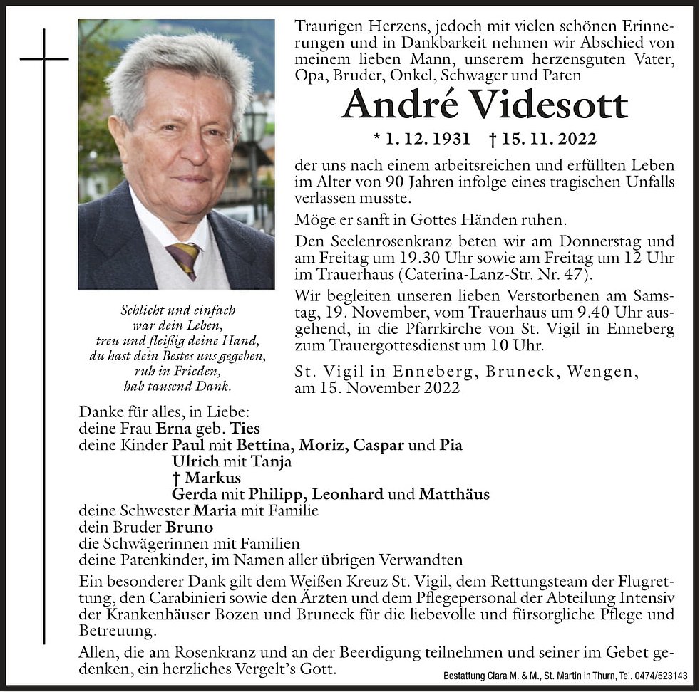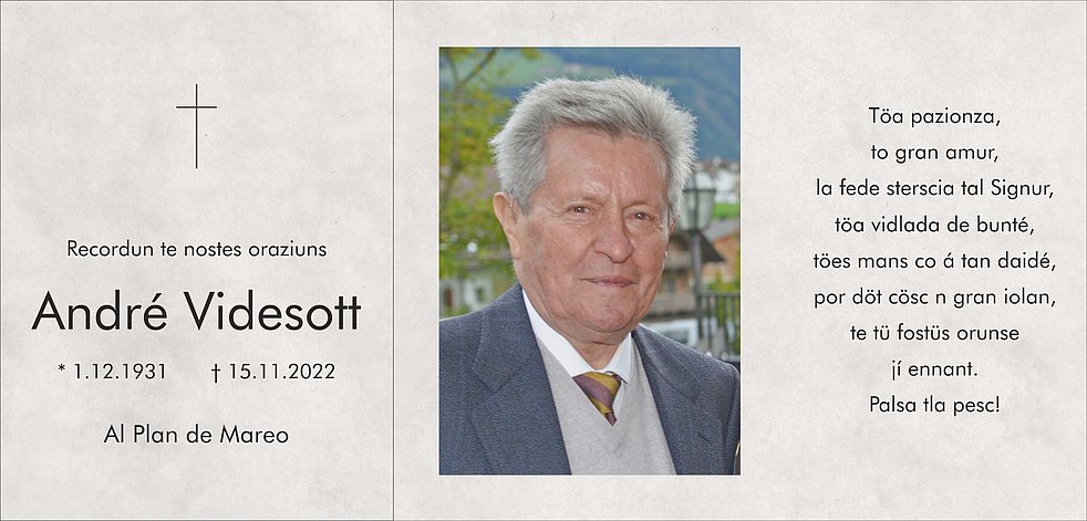 Wir begleiten unseren lieben Verstorbenen am Samstag, 19. November vom Trauerhaus um 9.40 Uhr ausgehend in die Pfarrkirche von St. Vigil in Enneberg zum Auferstehungsgottesdienst um 10.00 Uhr.