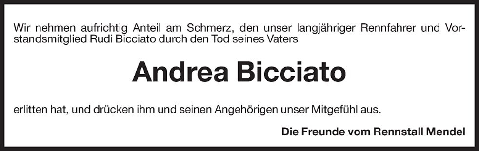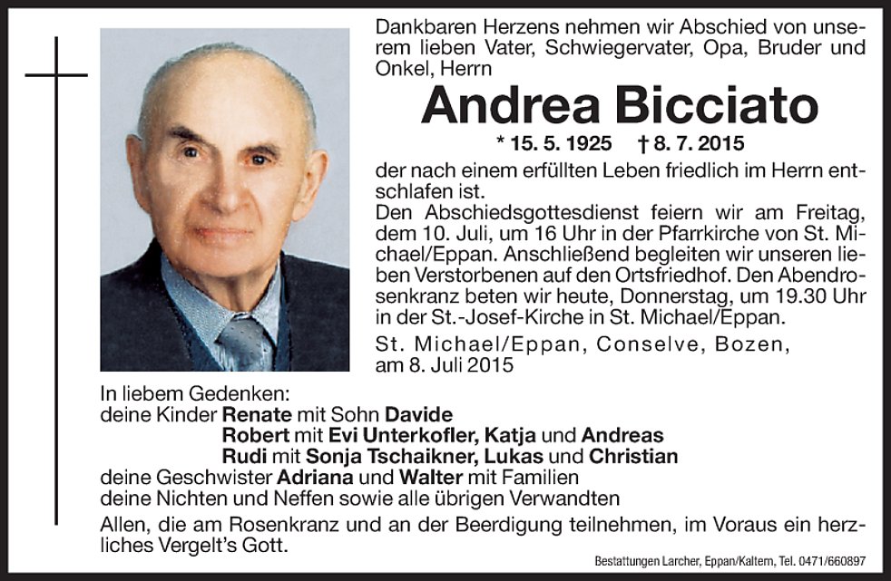 Den Abschiedsgottesdienst feiern wir am Freitag, dem 10. Juli, um 16 Uhr in der Pfarrkirche von St. Michael/Eppan. Anschließend begleiten wir unseren lieben Verstorbenen auf den Ortsfriedhof.