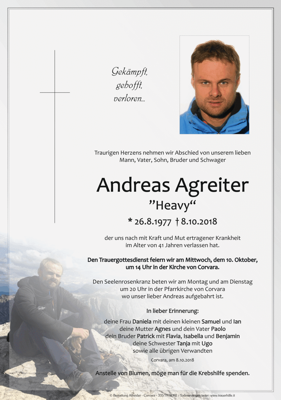 Den Trauergottesdienst feiern wir am Mittwoch, dem 10. Oktober, um 14 Uhr in der Kirche von Corvara.