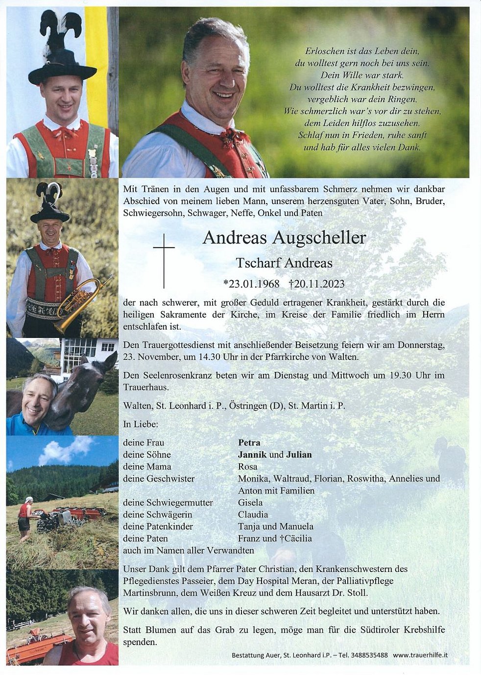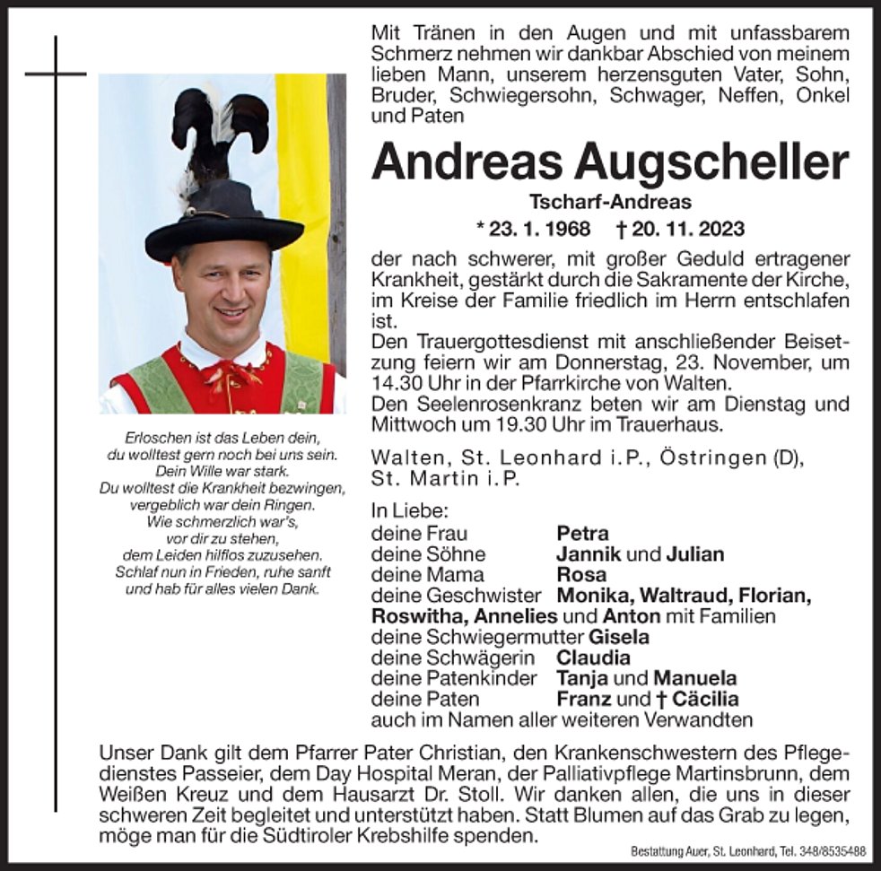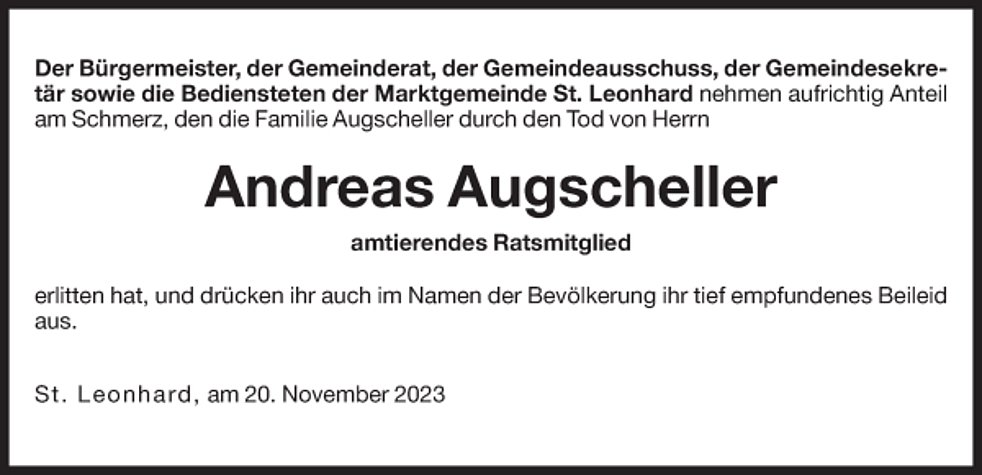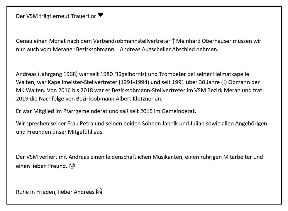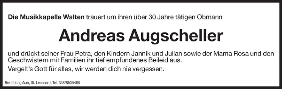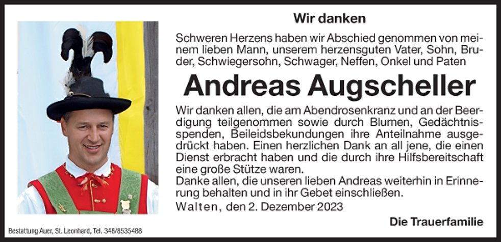 Den Trauergottesdienst mit anschließender Beisetzung feiern wir am Donnerstag, 23. November, um 14.30 Uhr in der Pfarrkirche von Walten