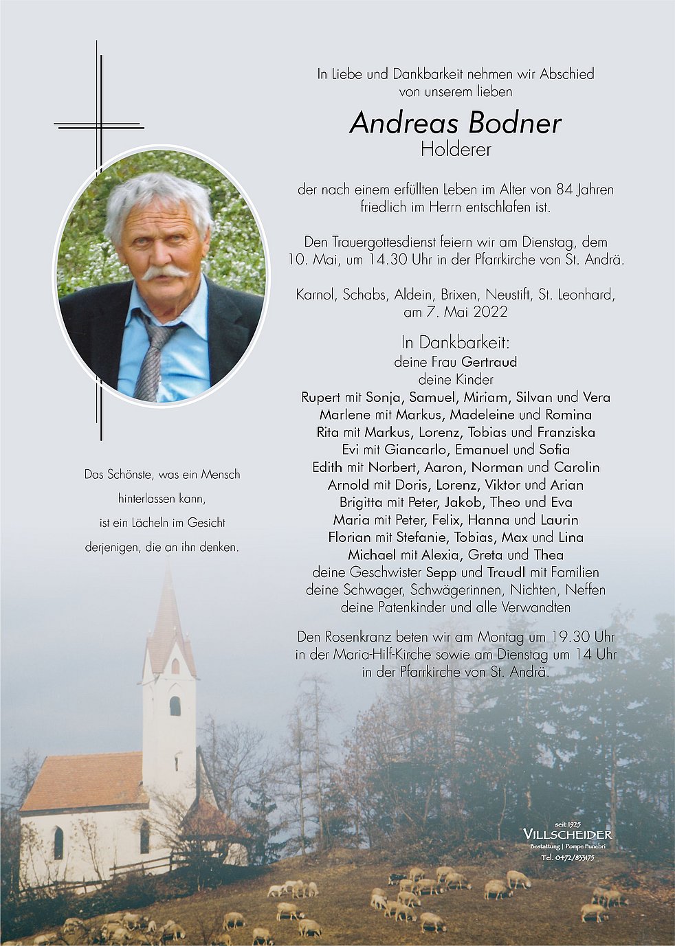 Sehr geehrte Familie Bodner! Zum schweren Verlust entbieten wir unsere aufrichtige Anteilnahme. In Euren Herzen und Erinnerungen wird der liebe Verstorbene weiterleben. Er möge Euch viel Kraft verleihen in diesen Tagen.