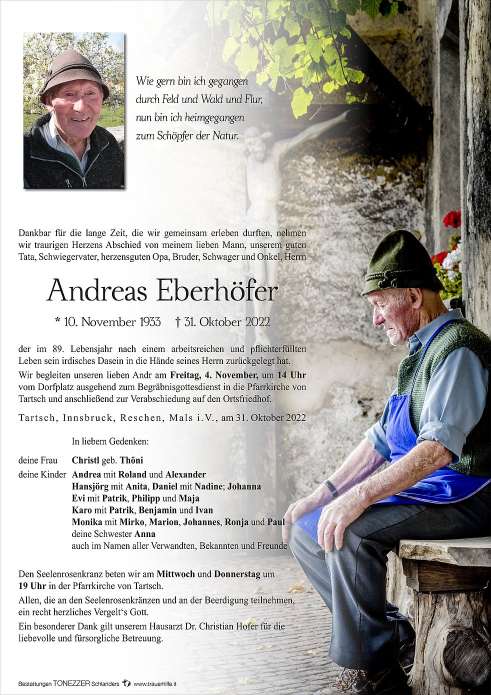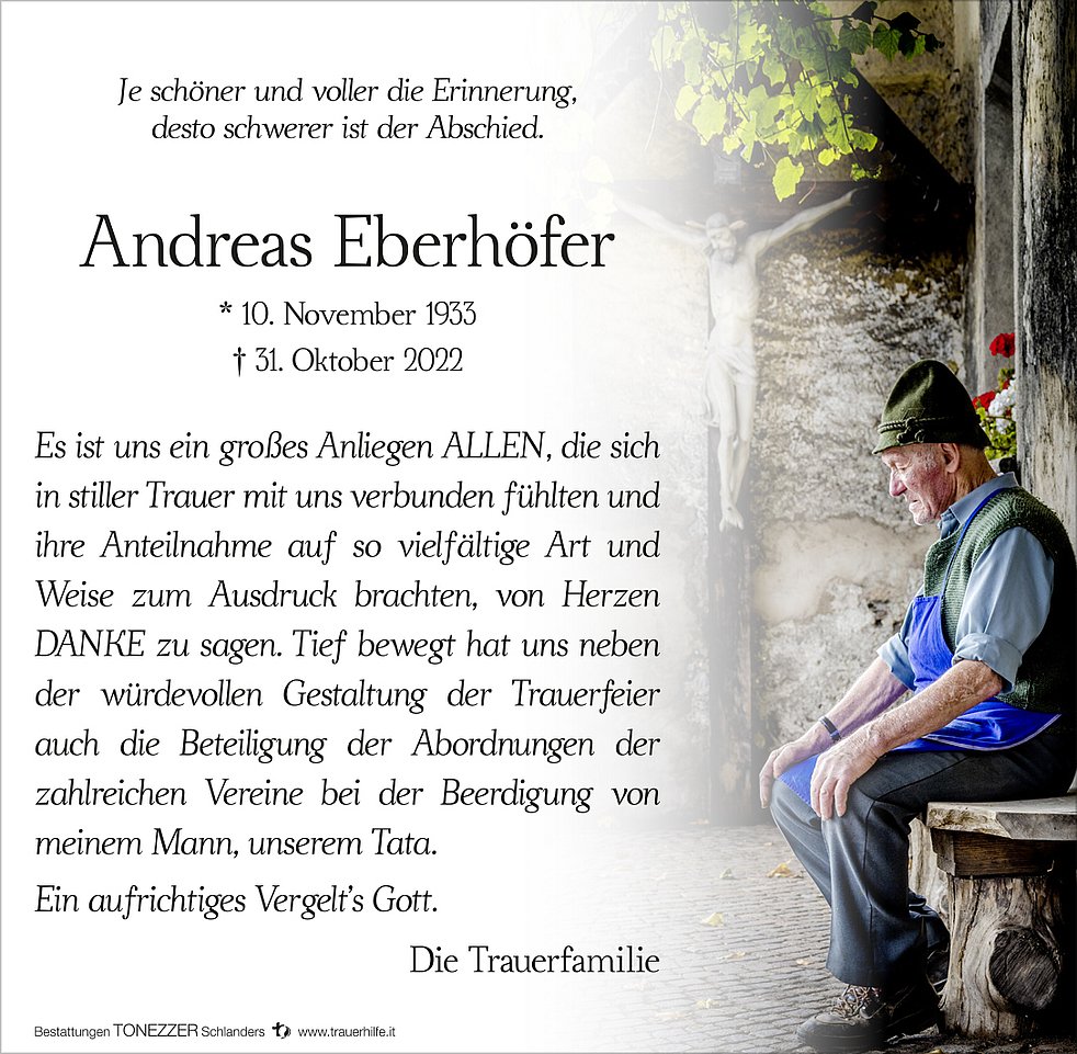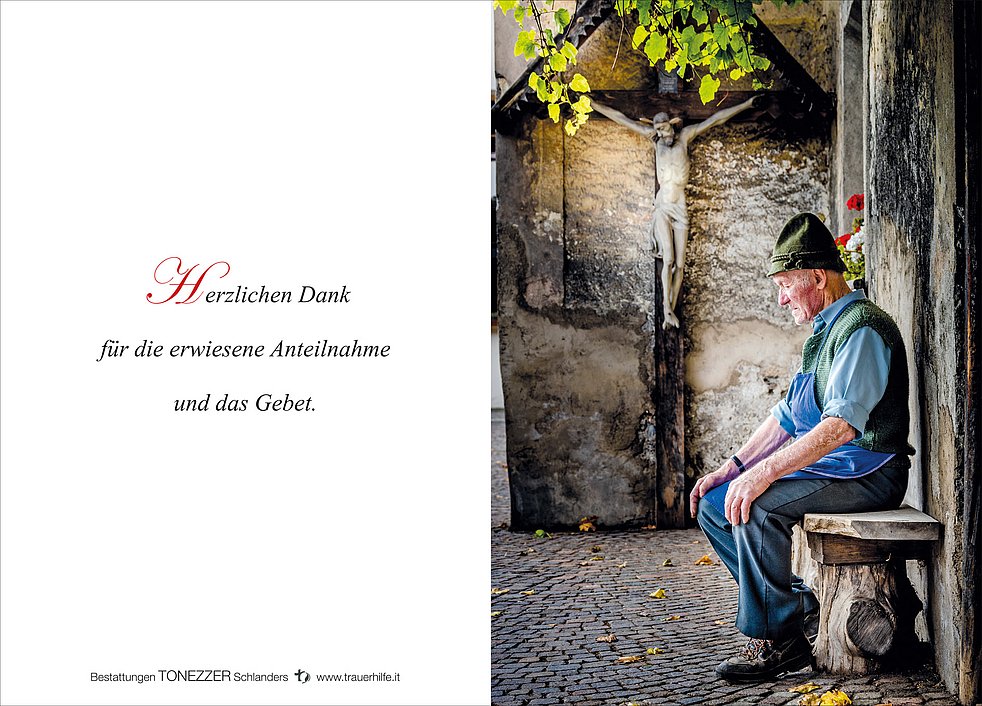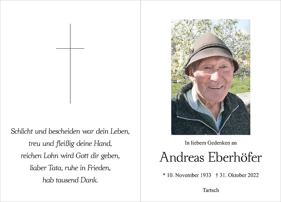 Wir begleiten unseren lieben Andr am Freitag, 4. November, um 14 Uhr vom Dorfplatz ausgehend zum Begräbnisgottesdienst in die Pfarrkirche von Tartsch und anschließend zur Verabschiedung auf den Ortsfriedhof.