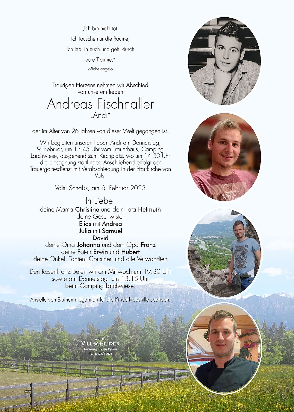 Liebe Christine mit Familie es tuet mir unendlich load dass do Andi enk / ins so friae verlossn hot er hot es gonze Leben no vor ihn kop ober leider et gewisst wie er es Leben soll er wor immer so ruhig zurückhaltend aber sehr liebevoll und hilfsbereit. ihn geats ietz guet und er losst enk et alloane er beschützt enk sell bin i mir gonz sicher. Ein lieber letzter Gruß für enkon Andi.....