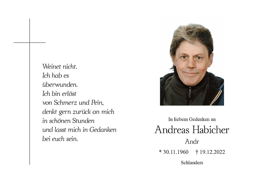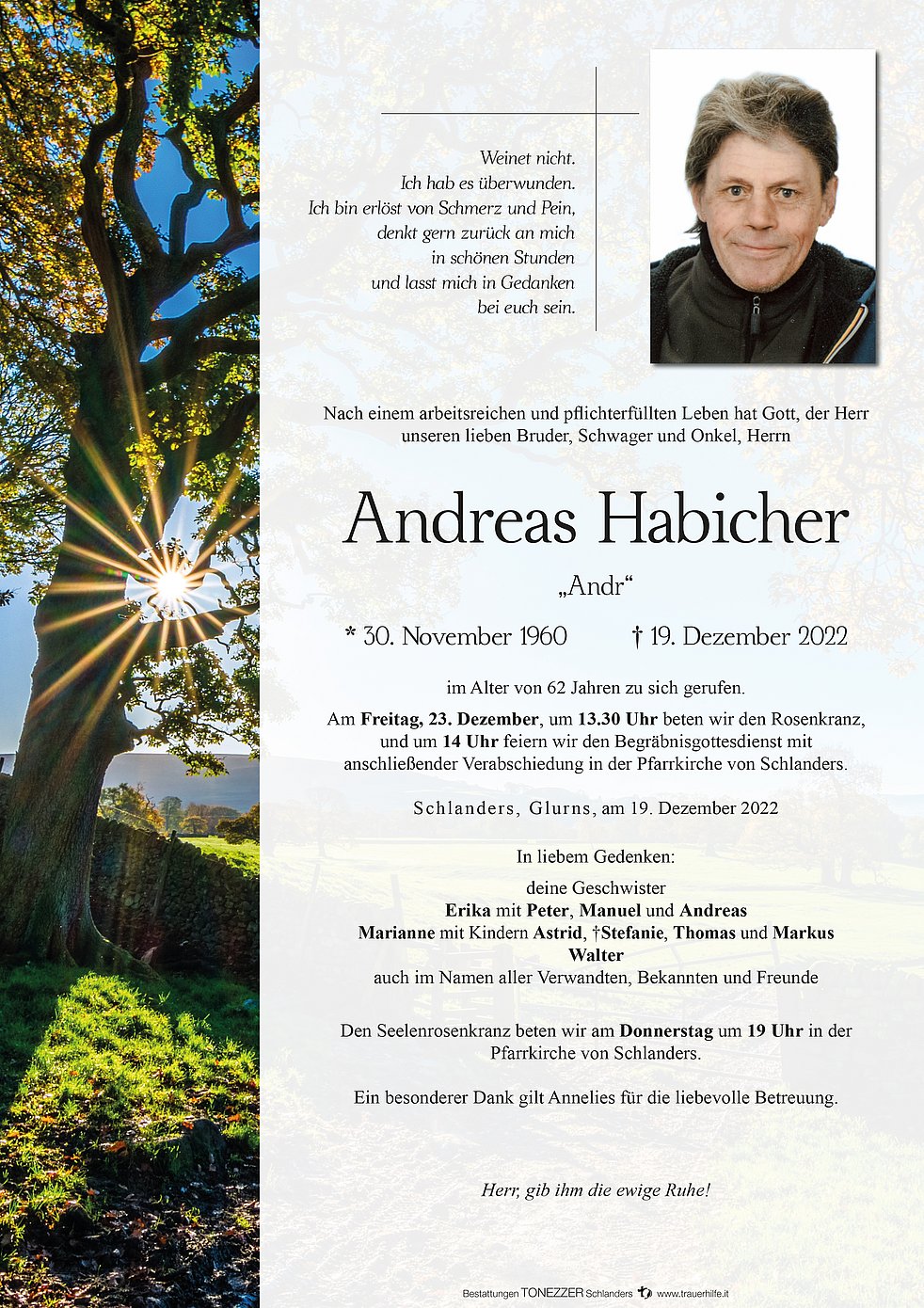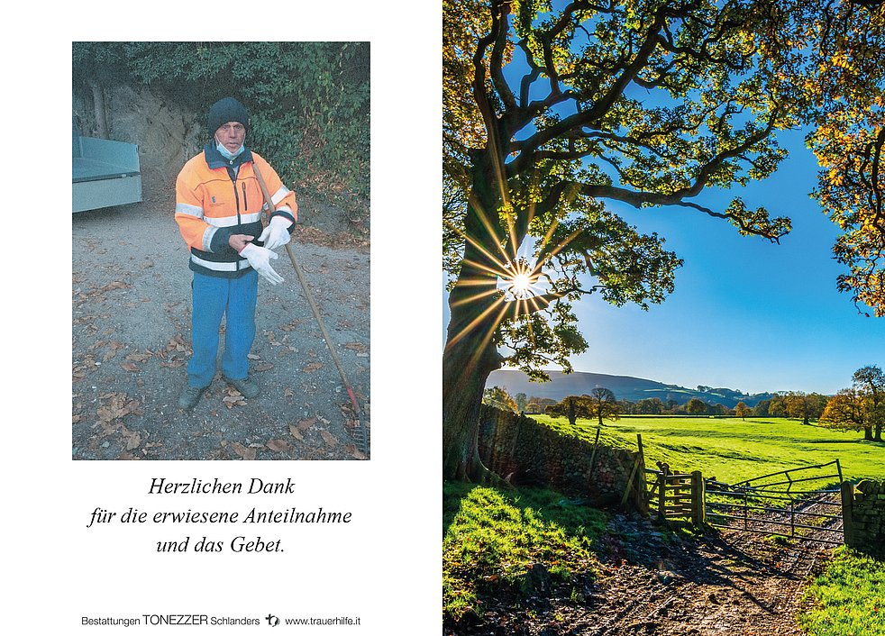 Am Freitag, 23. Dezember, um 13.30 Uhr beten wir den Rosenkranz, und um 14 Uhr feiern wir den Begräbnisgottesdienst mit anschließender Verabschiedung in der Pfarrkirche von Schlanders.
