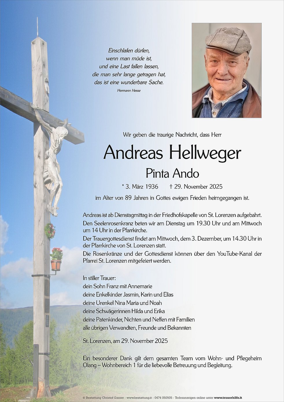 Andreas ist ab Dienstagmittag in der Friedhofskapelle von St. Lorenzen aufgebahrt.