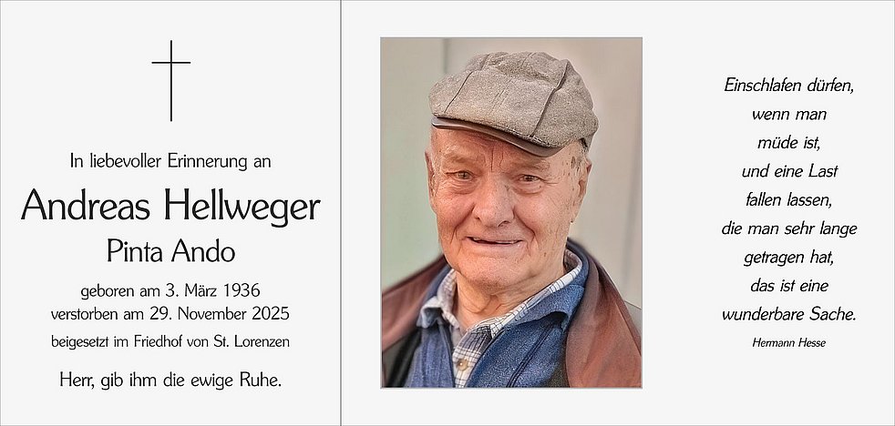 Der Trauergottesdienst findet am Mittwoch, dem 3. Dezember, um 14.30 Uhr in der Pfarrkirche von St. Lorenzen statt.