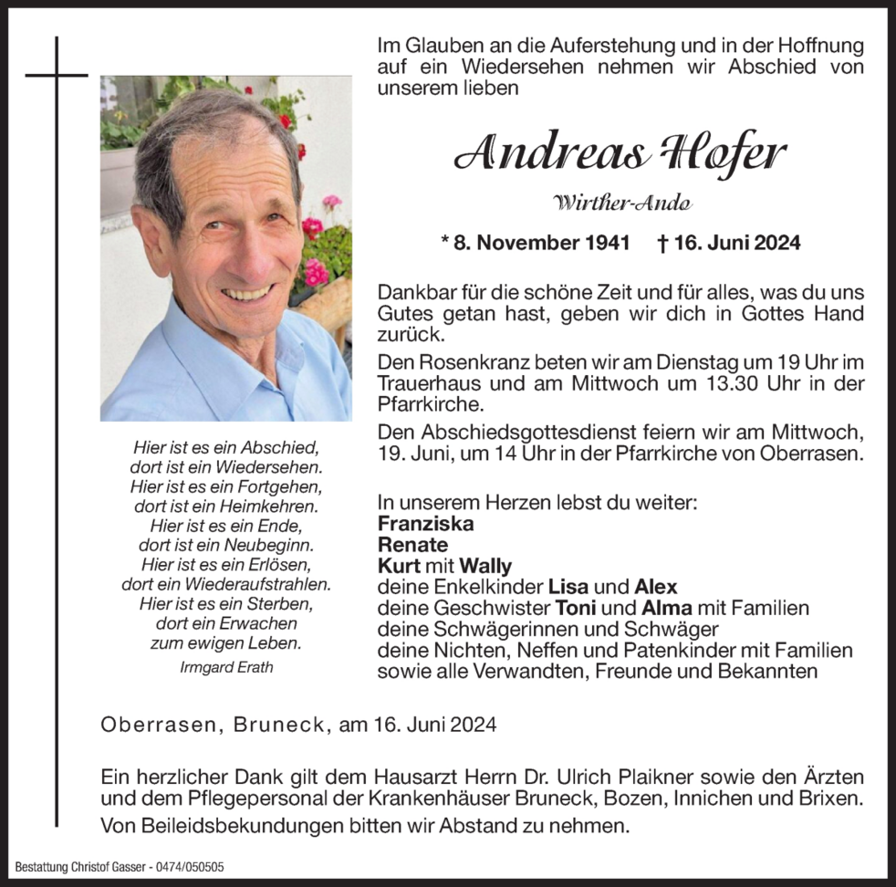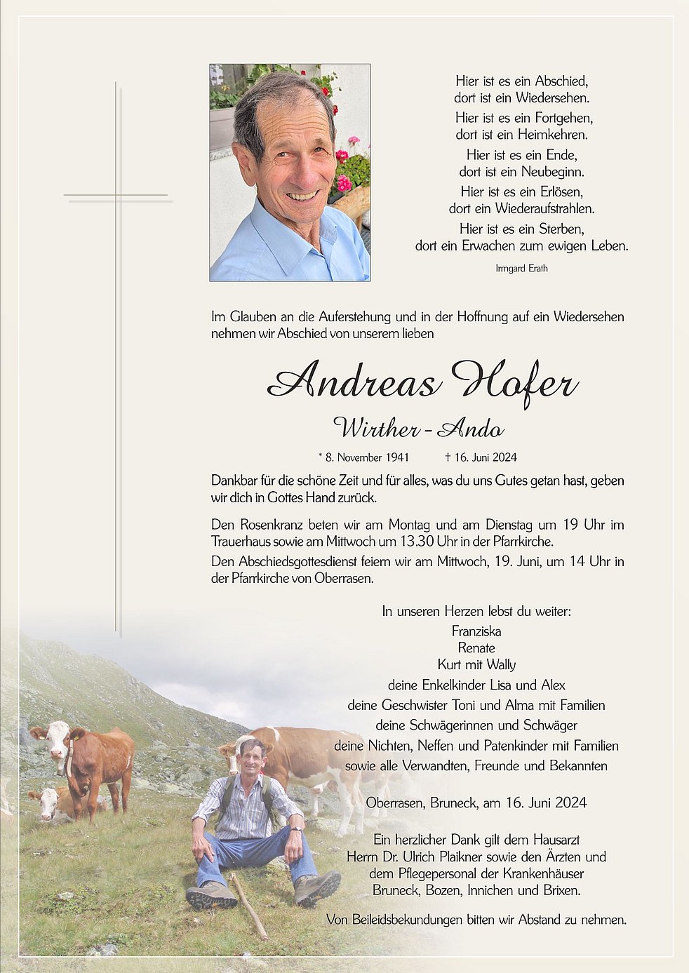 Im Glauben an die Auferstehung und in der Hoffnung auf ein Wiedersehen nehmen wir Abschied von unserem lieben
