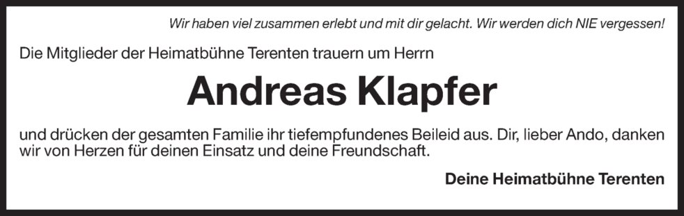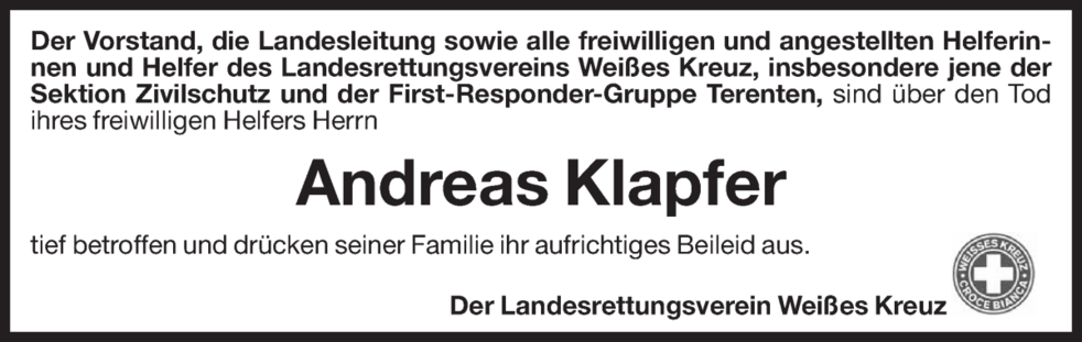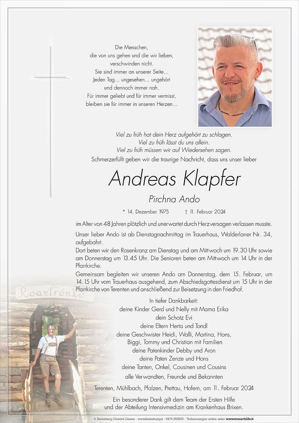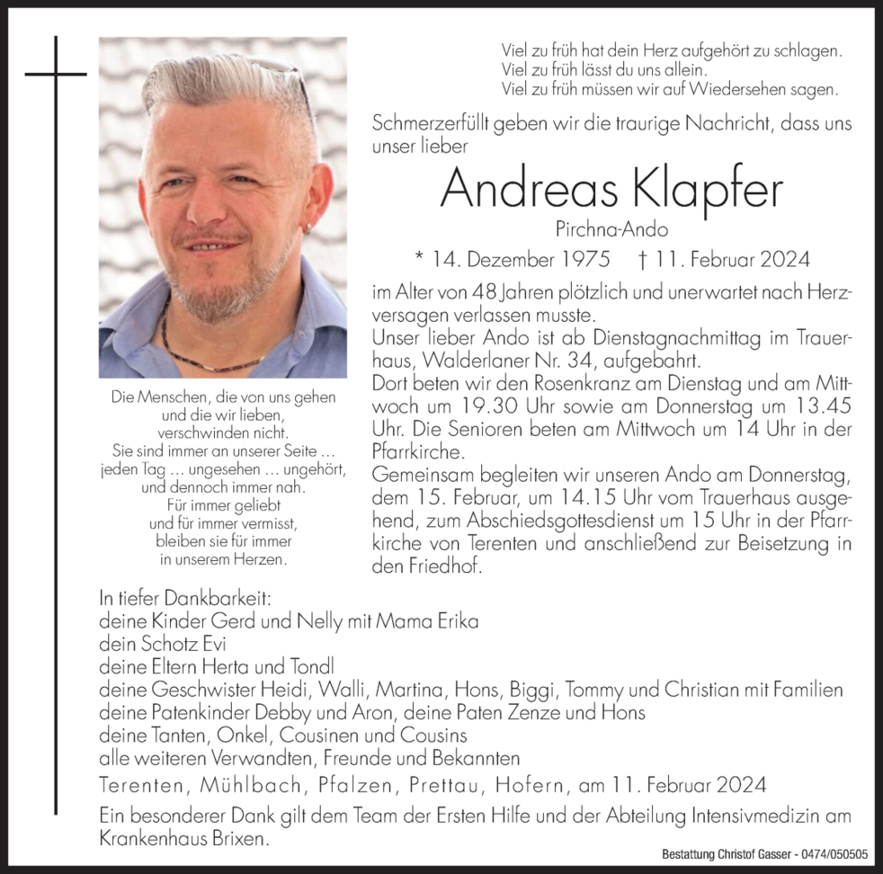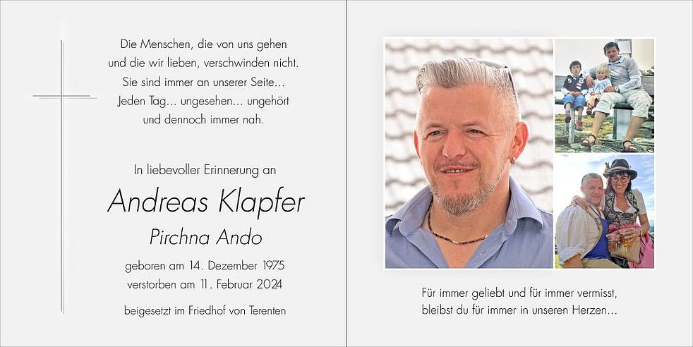 Gemeinsam begleiten wir unseren Ando am Donnerstag, dem 15. Februar, um 14.15 Uhr vom Trauerhaus ausgehend, zum Abschiedsgottesdienst um 15 Uhr in der Pfarrkirche von Terenten und anschließend zur Beisetzung in den Friedhof.
