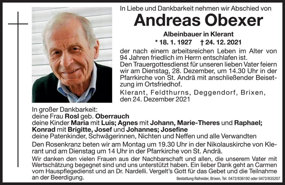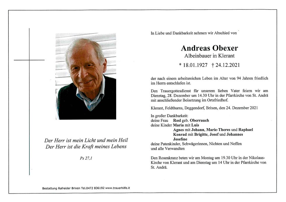 Den Trauergottesdienst für unserem lieben Vater feiern wir am Dienstag, 28. Dezember um 14.30 Uhr in der Pfarrkirche von St. Andrä mit anschließender Beisetzung im Ortsfriedhof.