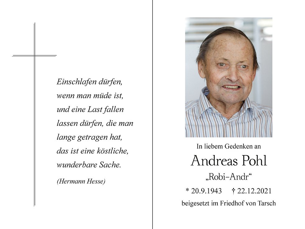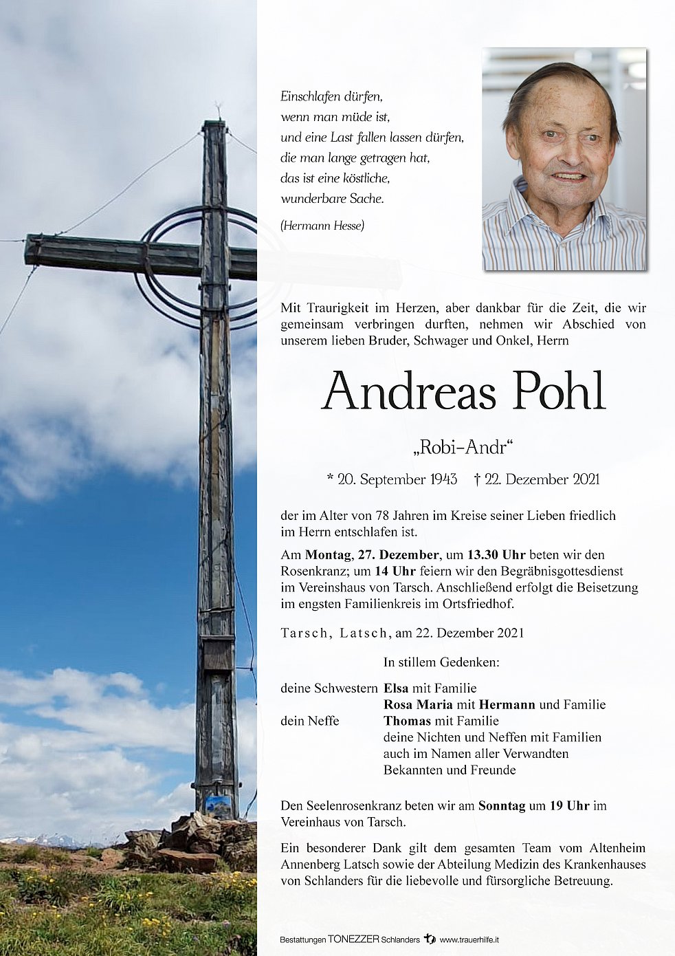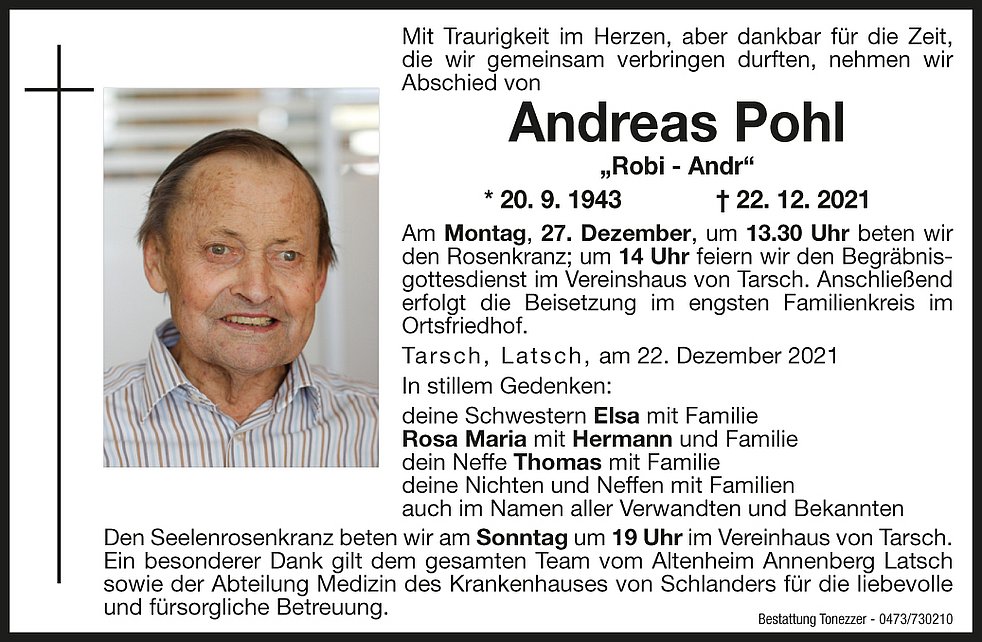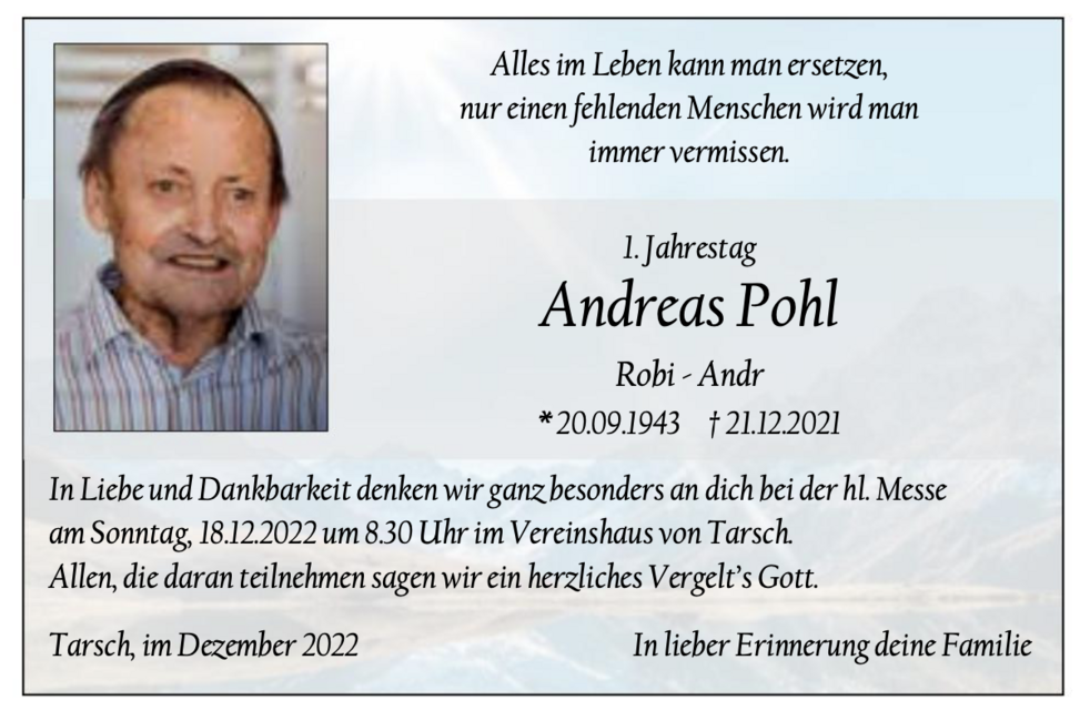 Am Montag, 27. Dezember, um 13.30 Uhr beten wir den Rosenkranz; um 14 Uhr feiern wir den Begräbnisgottesdienst im Vereinshaus von Tarsch.