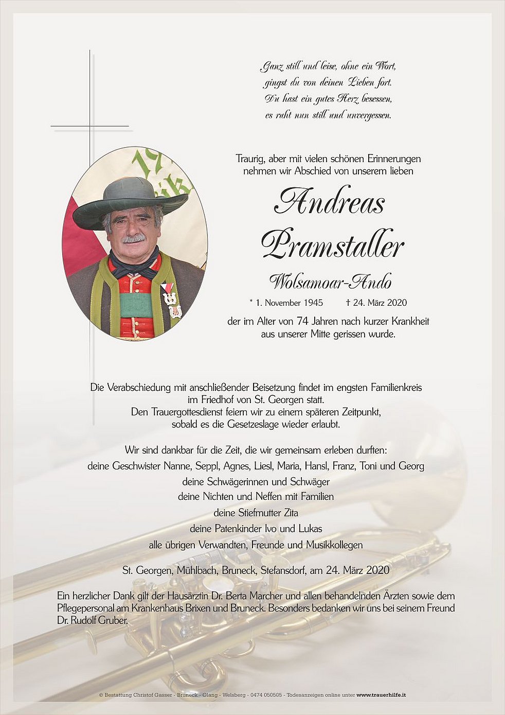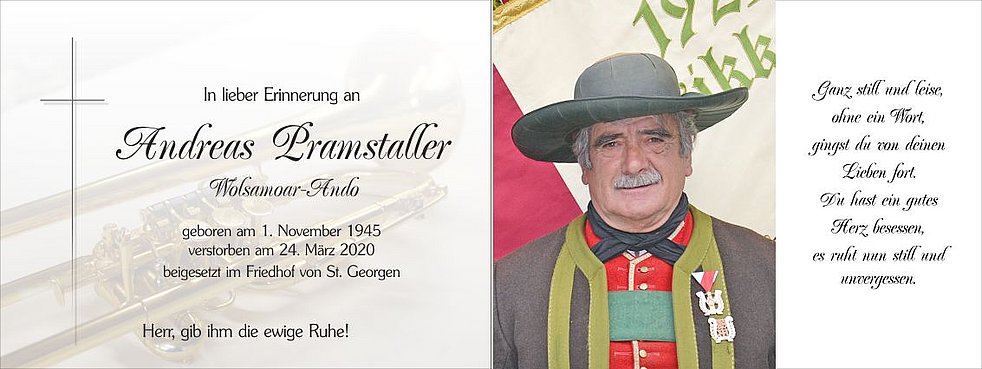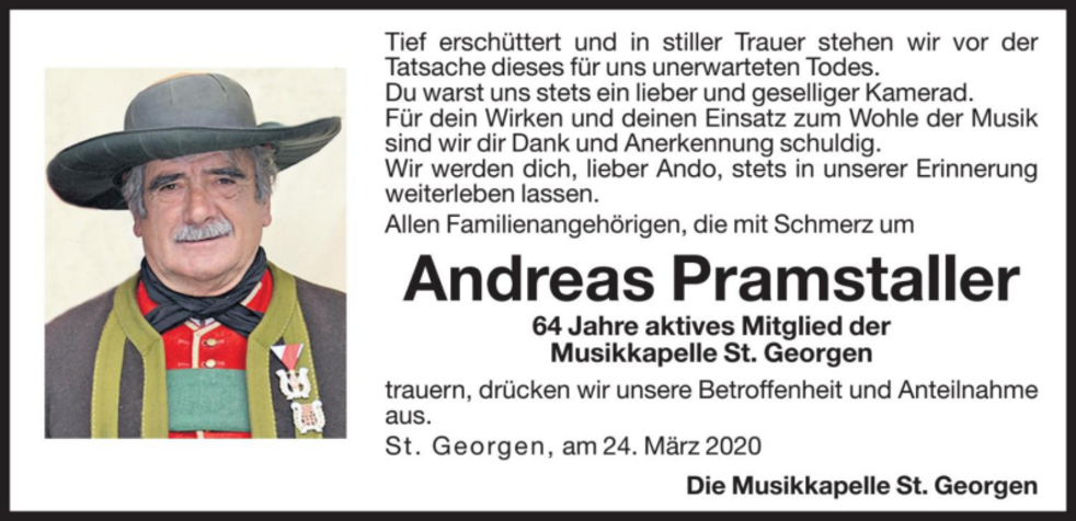 Die Verabschiedung mit anschließender Beisetzung findet im engsten Familienkreis im Friedhof von St. Georgen statt.