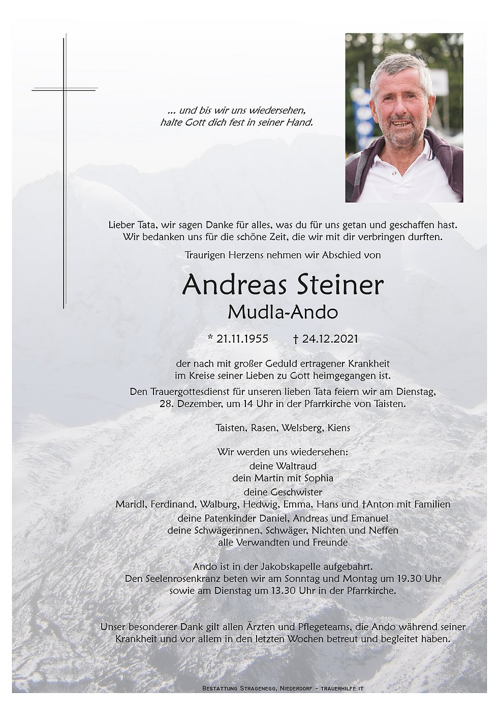 Den Trauergottesdienst für unseren lieben Tata feiern wir am Dienstag, 28. Dezember, um 14 Uhr in der Pfarrkirche von Taisten.