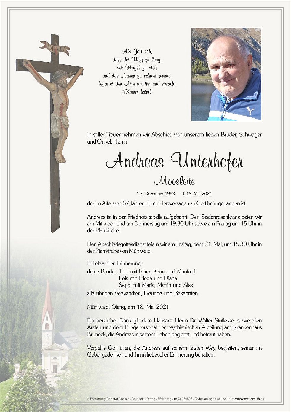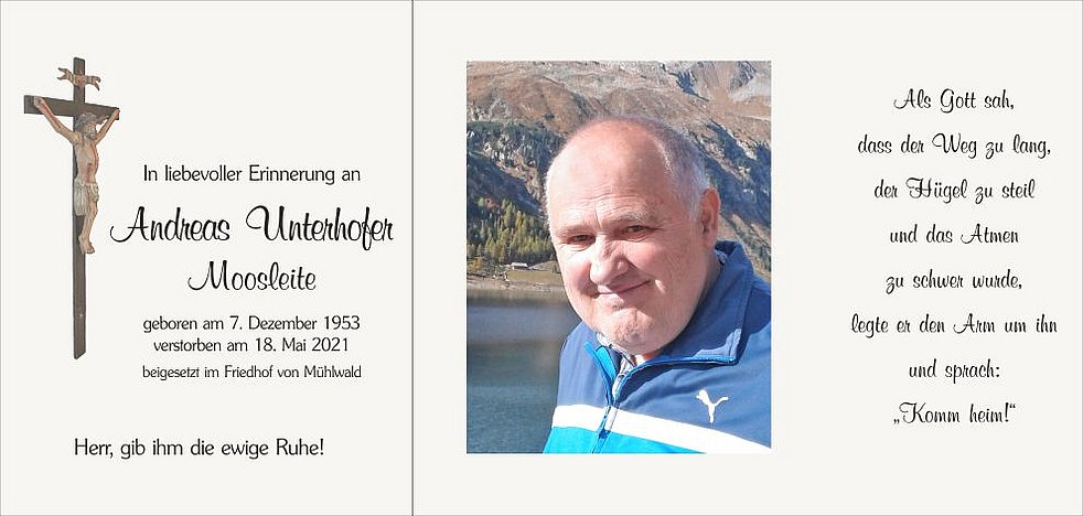 Vergelt’s Gott allen, die Andreas auf seinem letzten Weg begleiten, seiner im Gebet gedenken und ihn in liebevoller Erinnerung behalten.