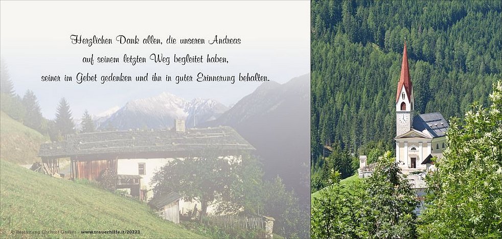 Ein herzlicher Dank gilt dem Hausarzt Herrn Dr. Walter Stuflesser sowie allen Ärzten und dem Pflegepersonal der psychiatrischen Abteilung am Krankenhaus Bruneck, die Andreas in seinem Leben begleitet und betreut haben.