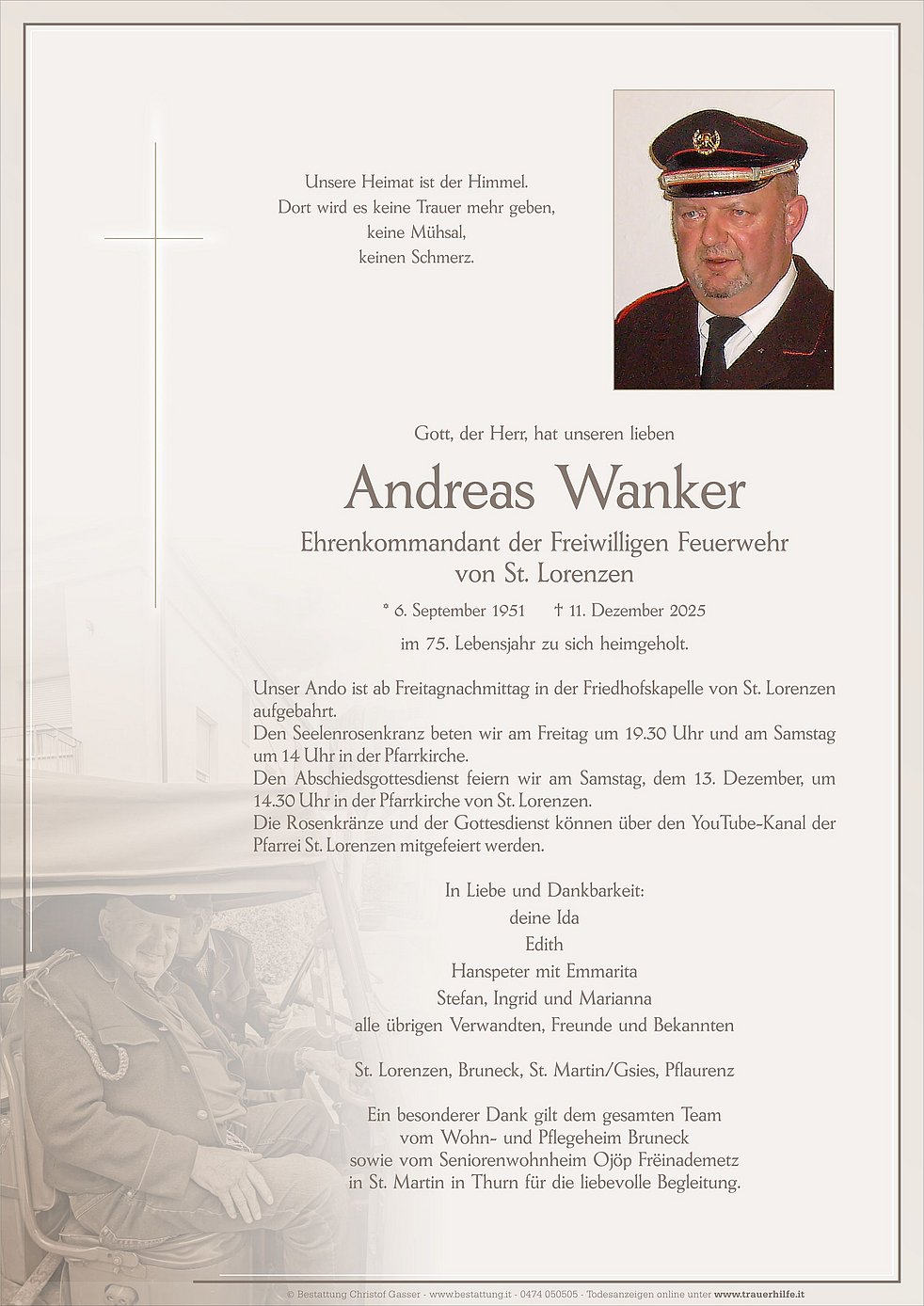 Den Abschiedsgottesdienst feiern wir am Samstag, dem 13. Dezember, um 14.30 Uhr in der Pfarrkirche von St. Lorenzen.