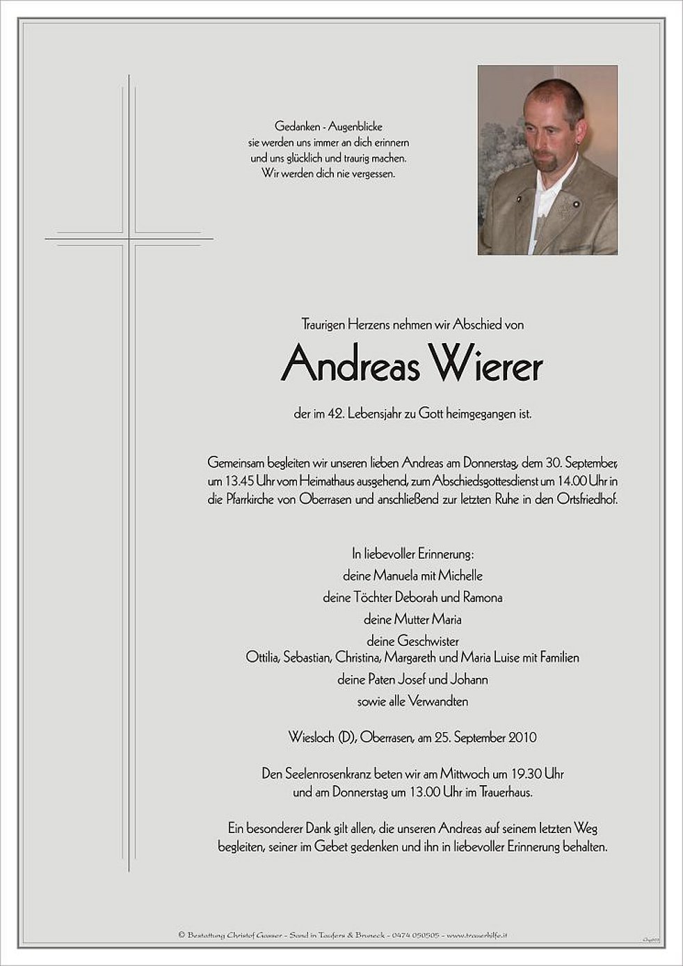 Gemeinsam begleiten wir unseren lieben Andreas am Donnerstag, dem 30. September, um 13.45 Uhr vom Heimathaus ausgehend, zum Abschiedsgottesdienst um 14.00 Uhr in die Pfarrkirche von Oberrasen und anschließend zur letzten Ruhe in den Ortsfriedhof.