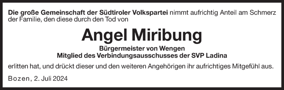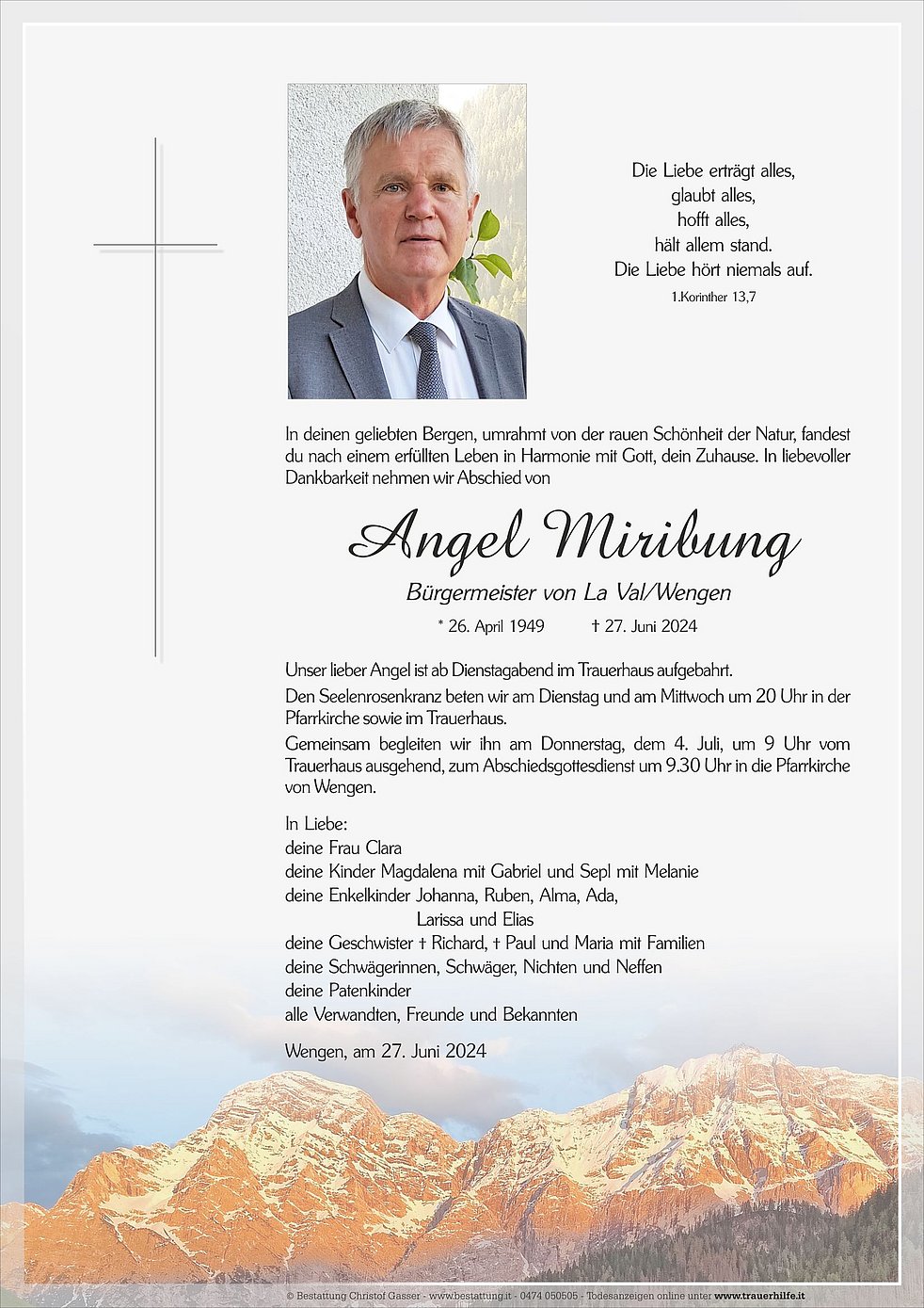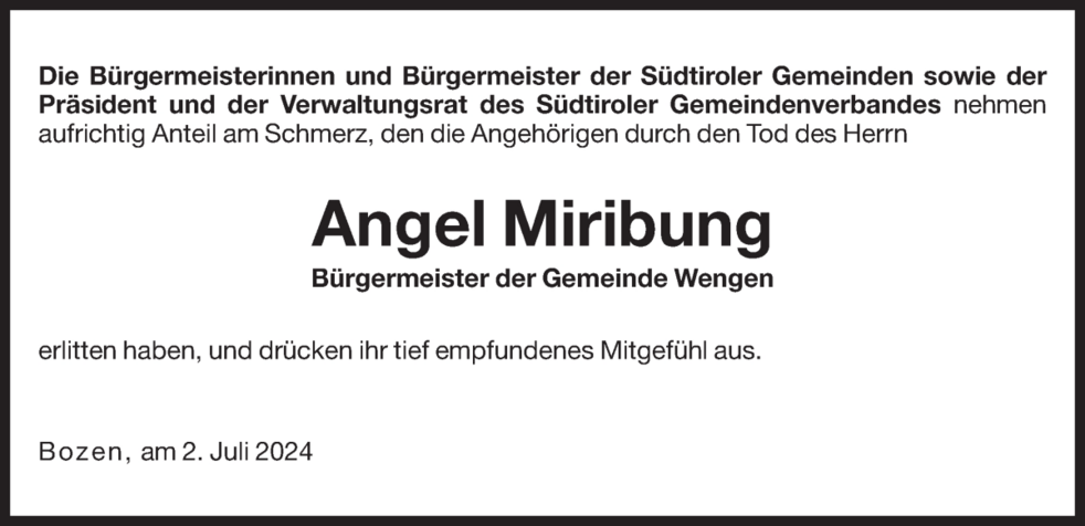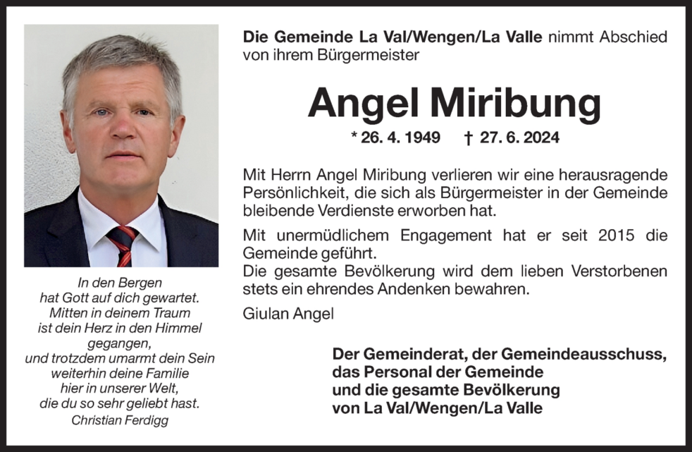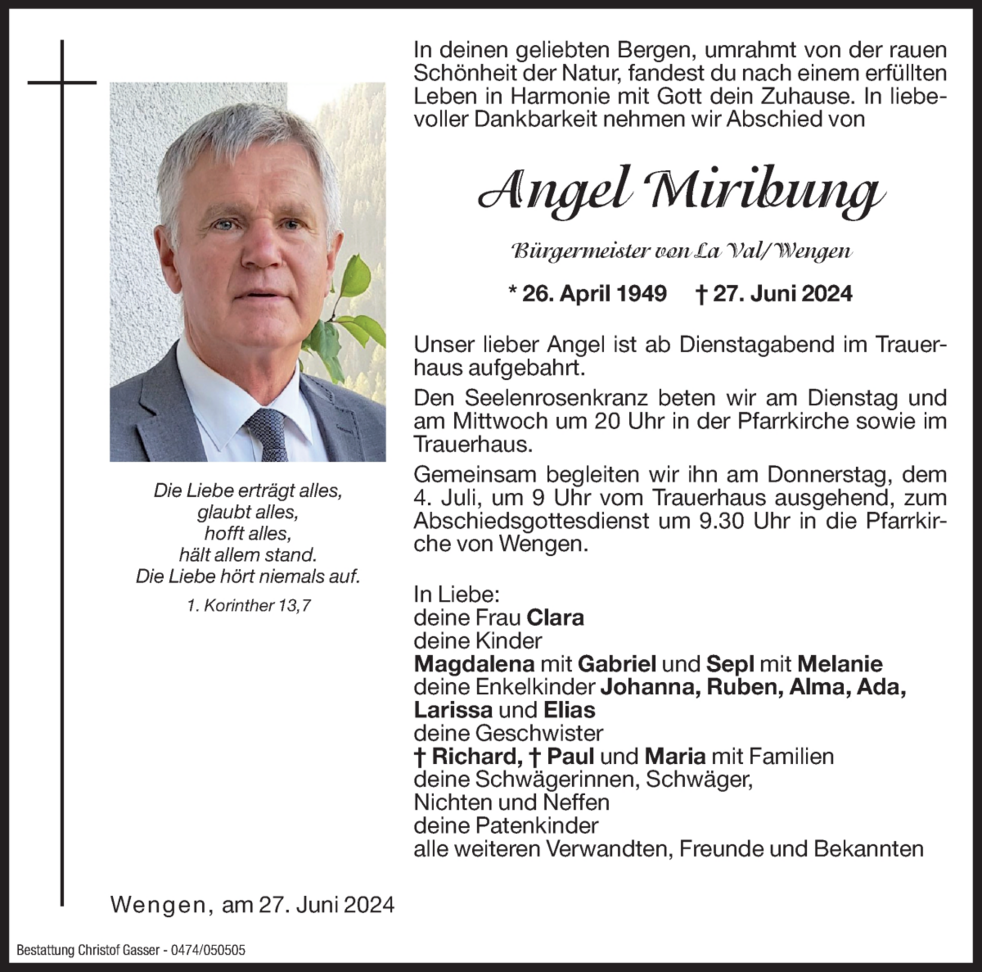 Gemeinsam begleiten wir ihn am Donnerstag, dem 4. Juli, um 9 Uhr vom Trauerhaus ausgehend, zum Abschiedsgottesdienst um 9.30 Uhr in die Pfarrkirche von Wengen.