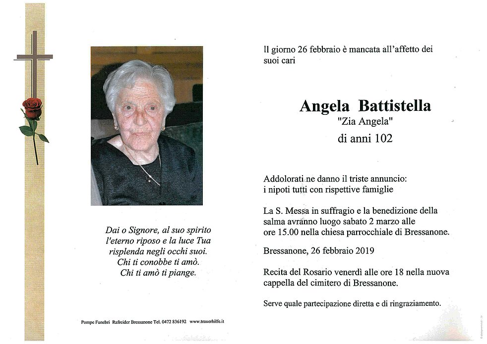 La S. Messa in suffragio e la benedizione della salma avranno luogo sabato 2 marzo alle ore 15.00 nella chiesa parrocchiale di Bressanone.