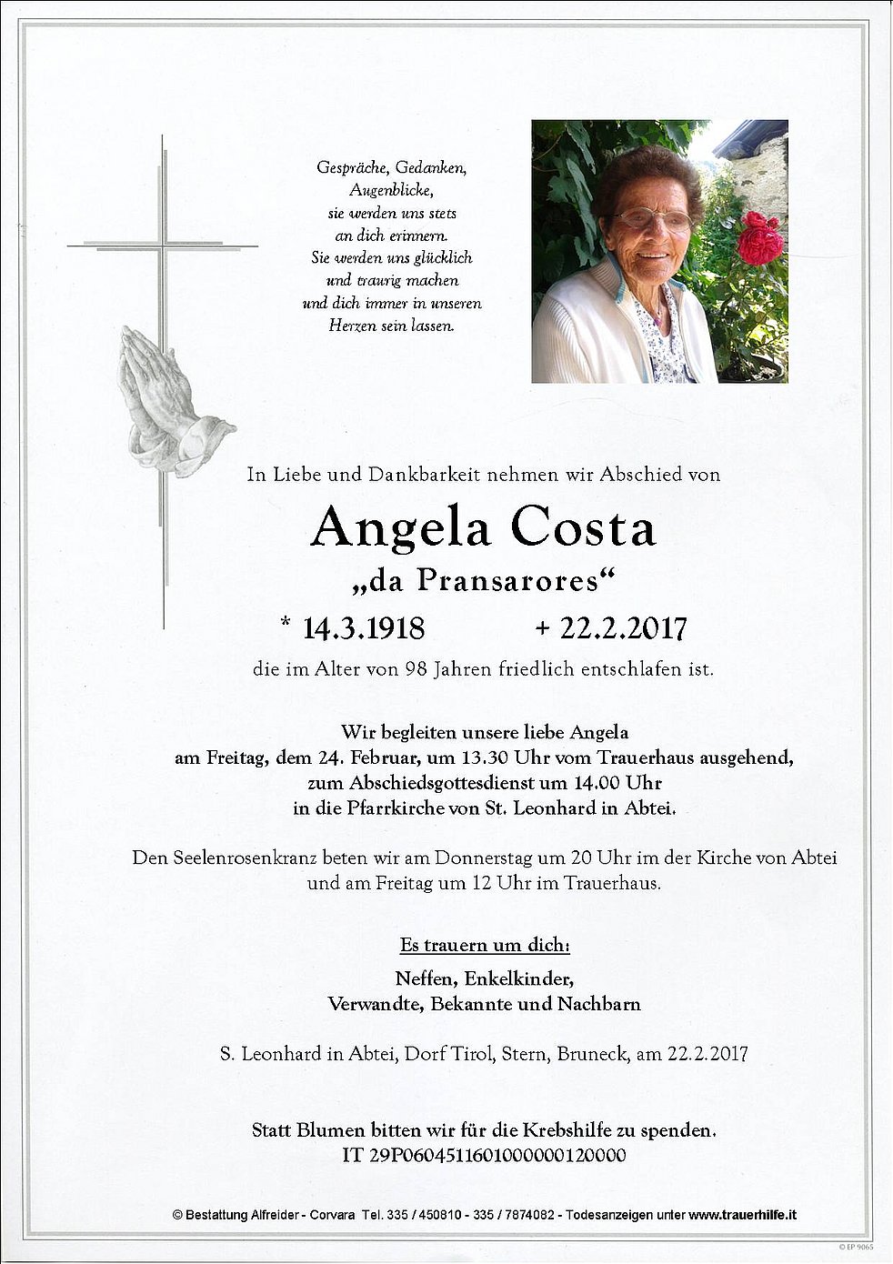 Statt Blumen bitten wir für die Krebshilfe zu spenden.