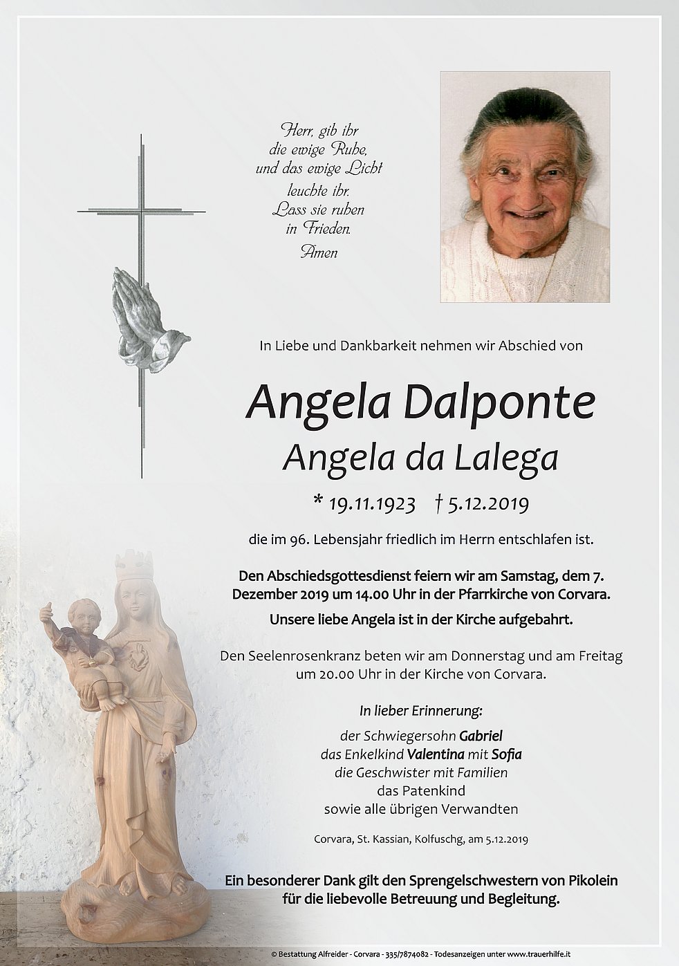 Den Abschiedsgottesdienst feiern wir am Samstag, dem 7. Dezember 2019 um 14.00 Uhr in der Pfarrkirche von Corvara.