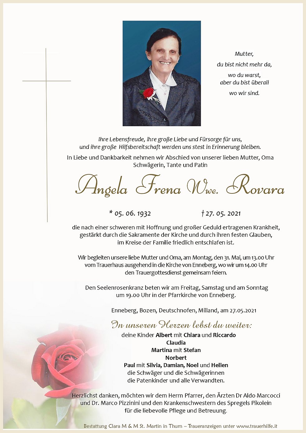 Wir begleiten unsere liebe Mutter und Oma, am Montag, den 31. Mai, um 13.00 Uhr vom Trauerhaus ausgehend in die Kirche von Enneberg, wo wir um 14.00 Uhr den Trauergottesdienst gemeinsam feiern.