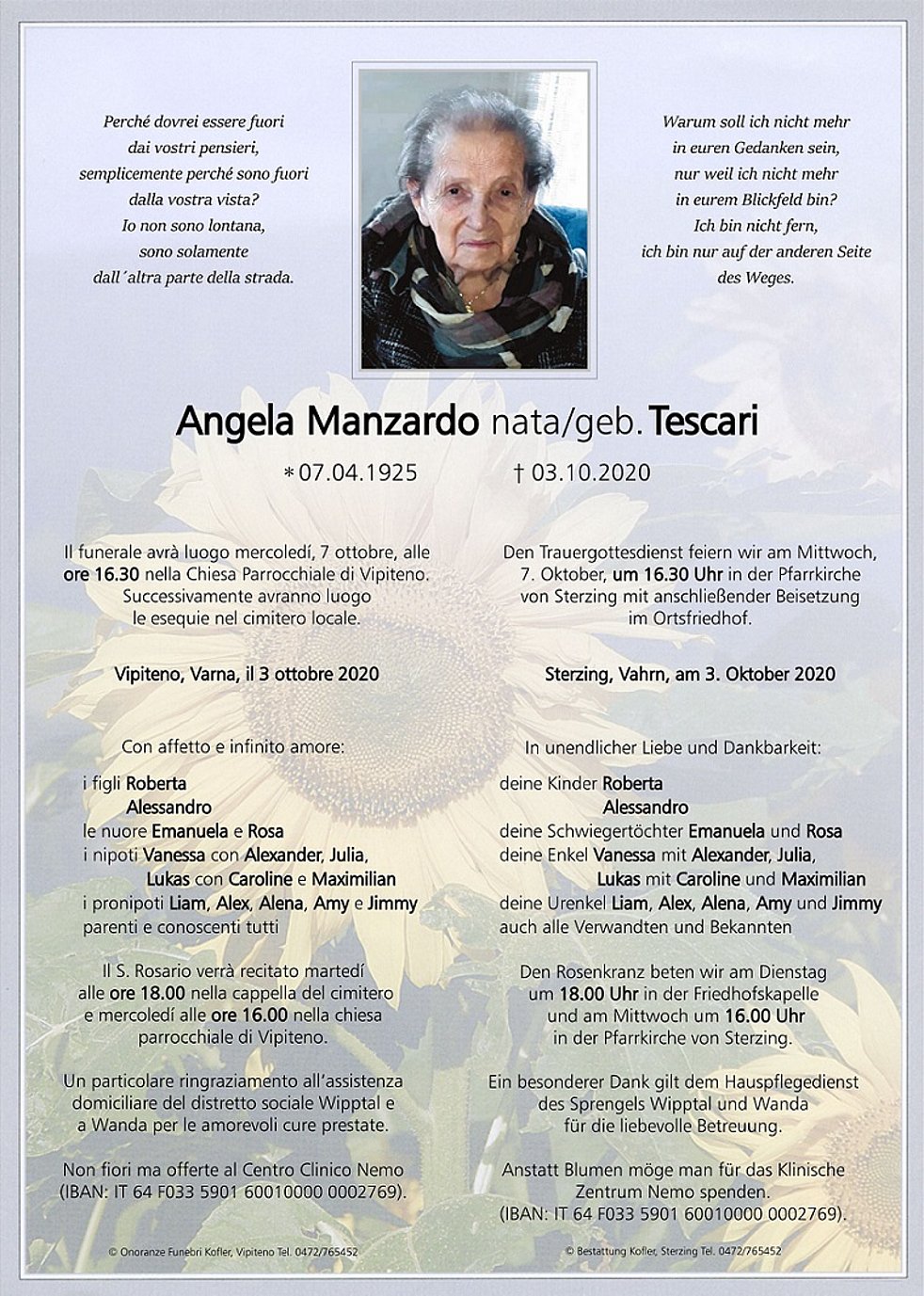 Il funerale avrà luogo mercoledí, 7 ottobre, alle ore 16.30 nella Chiesa Parrocchiale di Vipiteno. Successivamente avranno luogo le esequie nel cimitero locale.