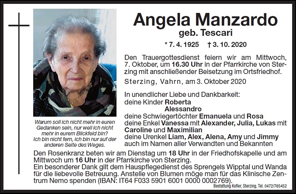 Anstatt Blumen möge man für das Klinische Zentrum Nemo spenden. (IBAN: IT 64 F033 5901 60010000 0002769).