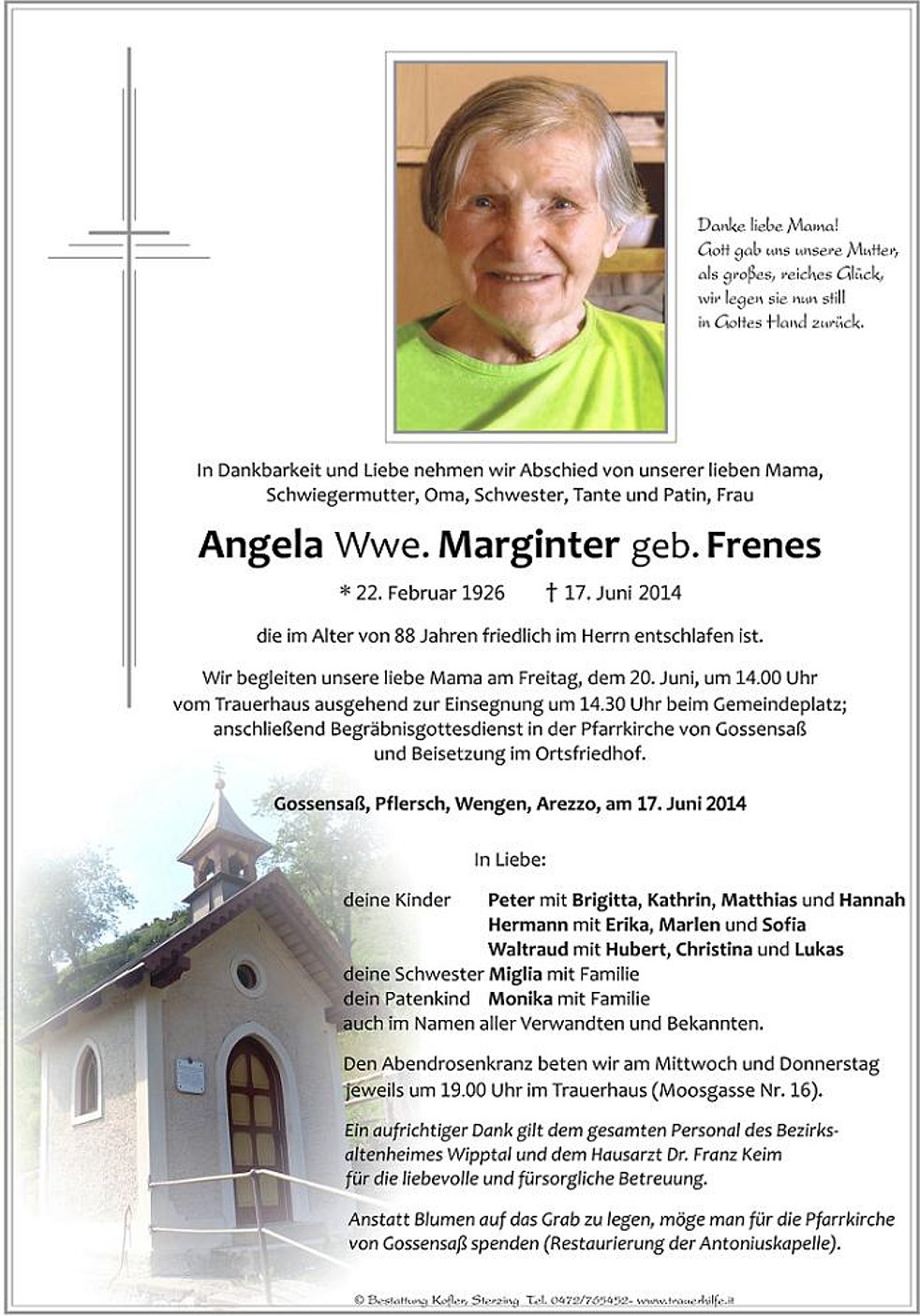 Anstatt Blumen auf das Grab zu legen, möge man für die Pfarrkirche von Gossensaß spenden (Restaurierung der Antoniuskapelle).