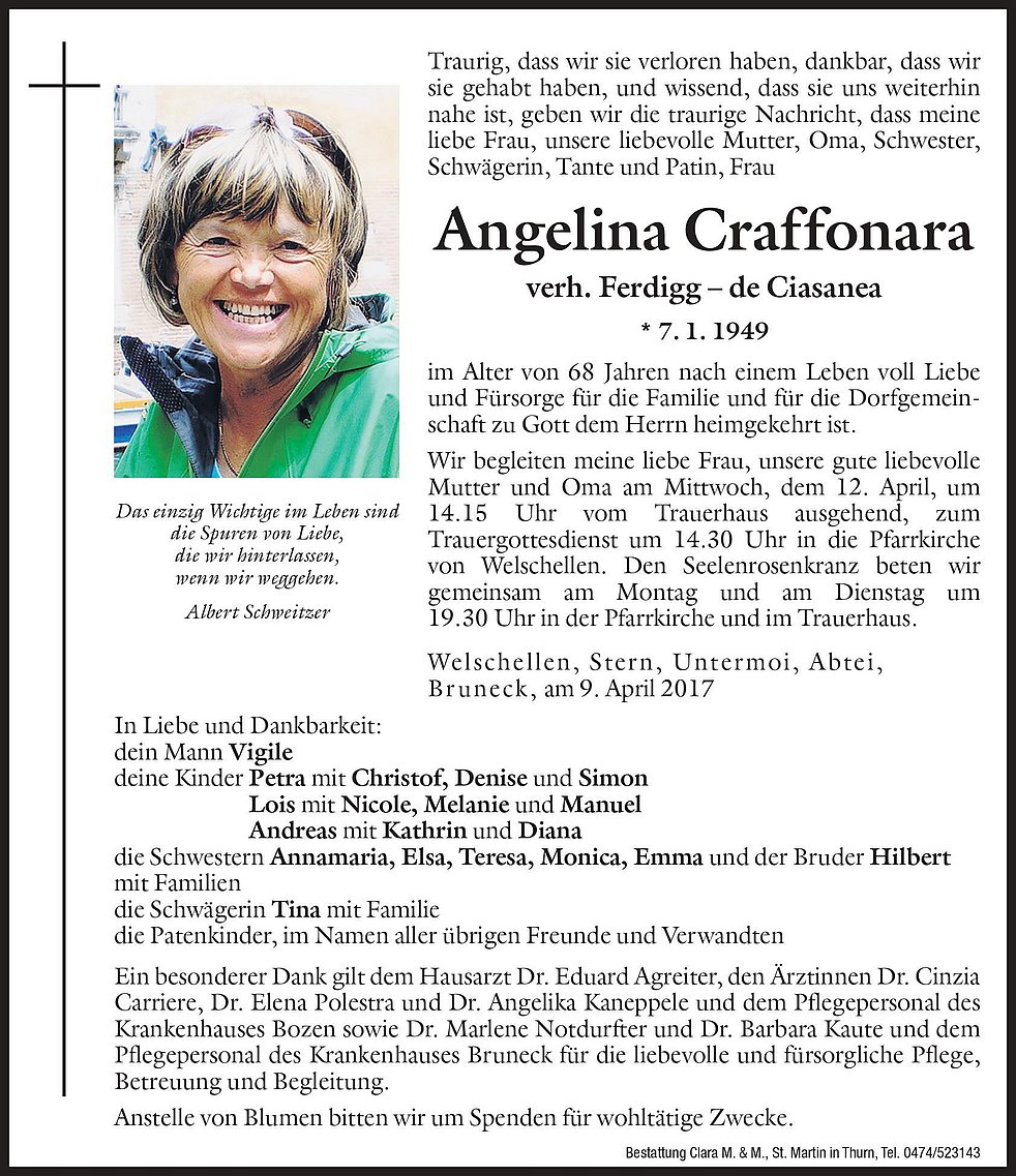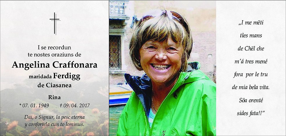 Ein besonderer Dank gilt dem Hausarzt Dr. Eduard Agreiter, den Ärztinnen Dr. Cinzia Carriere, Dr. Elena Polestra und Dr. Angelika Kaneppele und dem Pflegepersonal des Krankenhauses Bozen sowie Dr. Marlene Notdurfter und Dr. Barbara Kaute und dem Pflegepersonal des Krankenhauses Bruneck für die liebevolle und fürsorgliche Pflege, Betreuung und Begleitung.