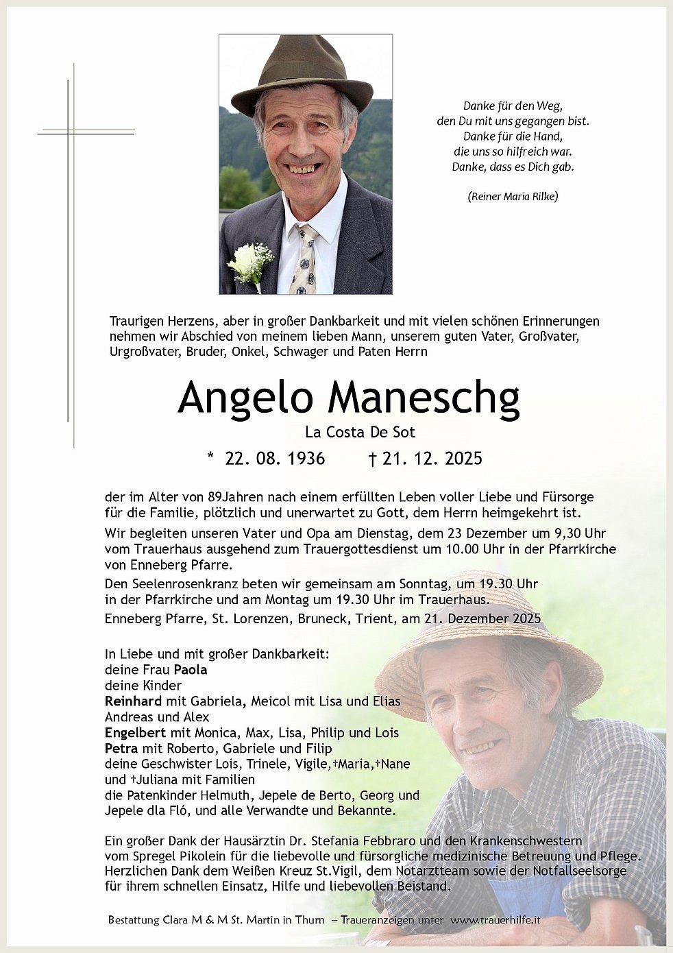 Begräbnisgottesdienst: 23.12. - 10:00 Uhr Enneberg Pfarre
