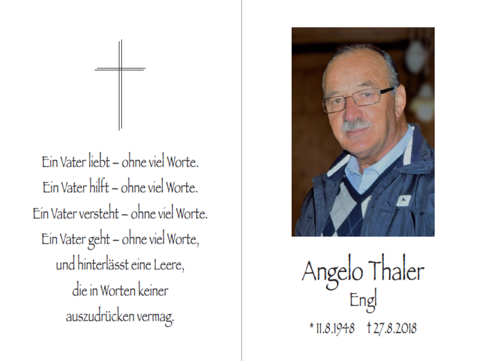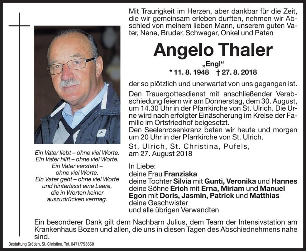 Den Trauergottesdienst mit anschließender Verabschiedung feiern wir am Donnerstag, dem 30. August, um 14.30 Uhr in der Pfarrkirche von St. Ulrich. Die Urne wird nach erfolgter Einäscherung im Kreise der Familie im Ortsfriedhof beigesetzt.