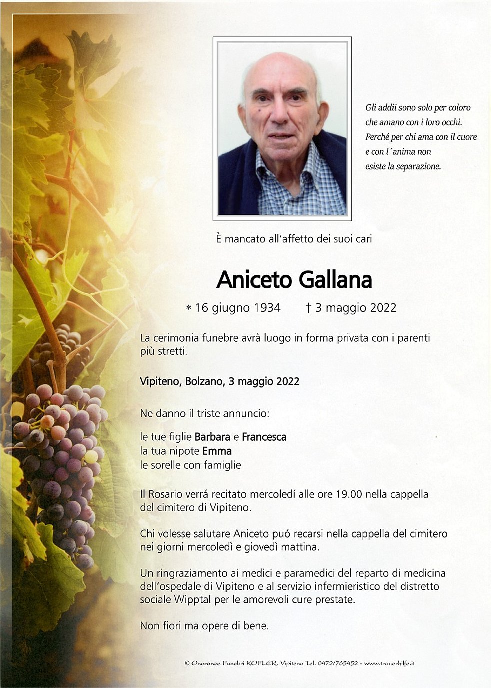 Chi volesse salutare Aniceto puó recarsi nella cappella del cimitero nei giorni mercoledì e giovedì mattina.