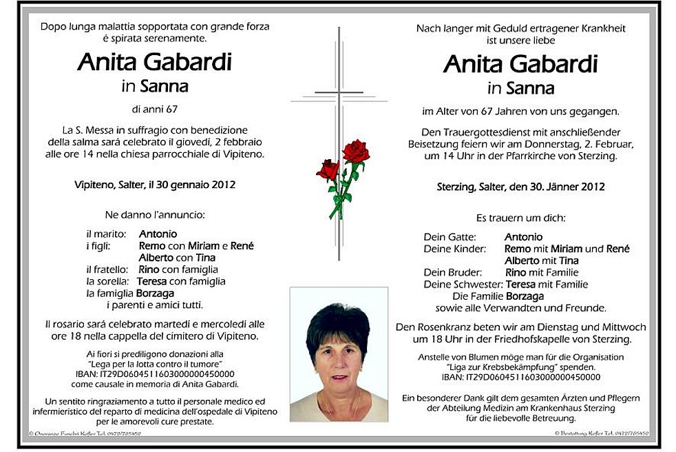 Un sentito ringraziamento a tutto il personale medico ed infermieristico del reparto di medicina dell’ospedale di Vipiteno per le amorevoli cure prestate.