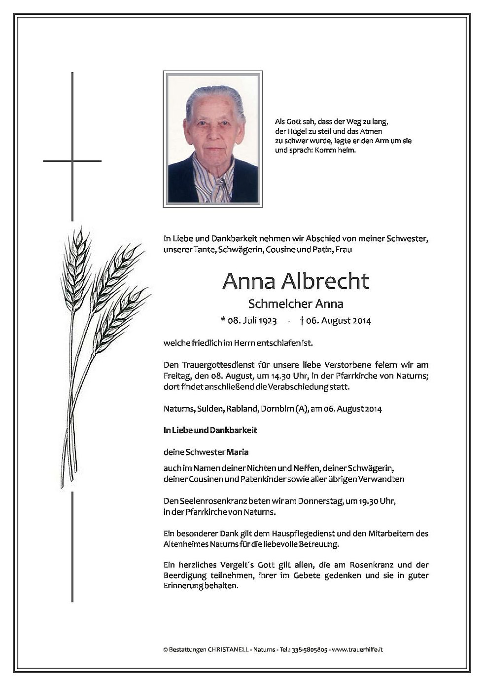 Den Trauergottesdienst für unsere liebe Verstorbene feiern wir am Freitag, den 08. August, um 14.30 Uhr, in der Pfarrkirche von Naturns; dort findet anschließend die Verabschiedung statt.
