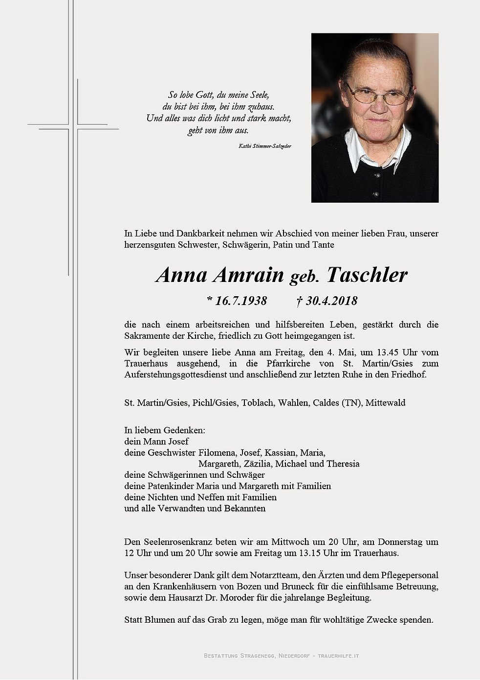 Wir begleiten unsere liebe Anna am Freitag, den 4. Mai, um 13.45 Uhr vom Trauerhaus ausgehend, in die Pfarrkirche von St. Martin/Gsies zum Auferstehungsgottesdienst und anschließend zur letzten Ruhe in den Friedhof.