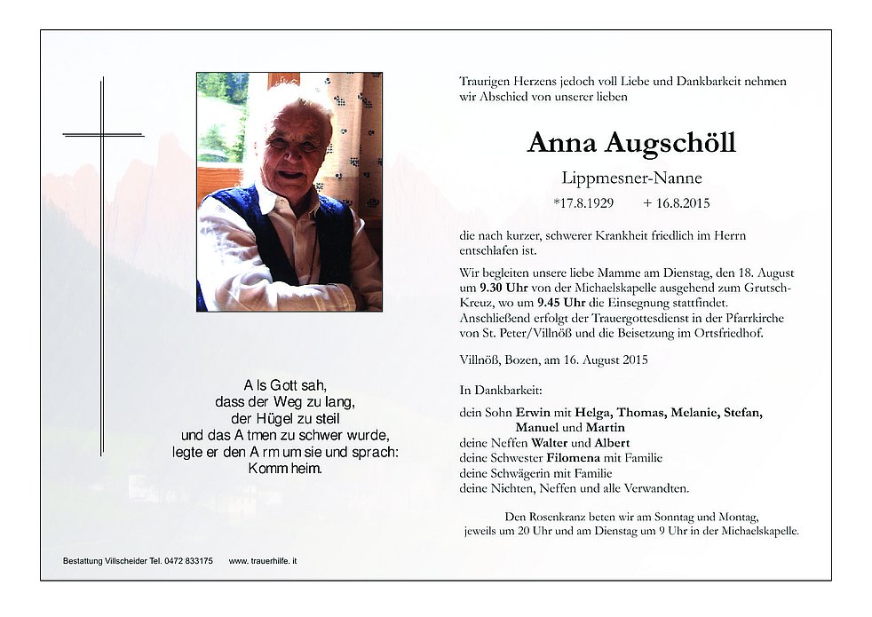 Wir begleiten unsere liebe Mamme am Dienstag, den 18. August um 9.30 Uhr von der Michaelskapelle ausgehend zum Grutsch-Kreuz, wo um 9.45 Uhr die Einsegnung stattfindet.