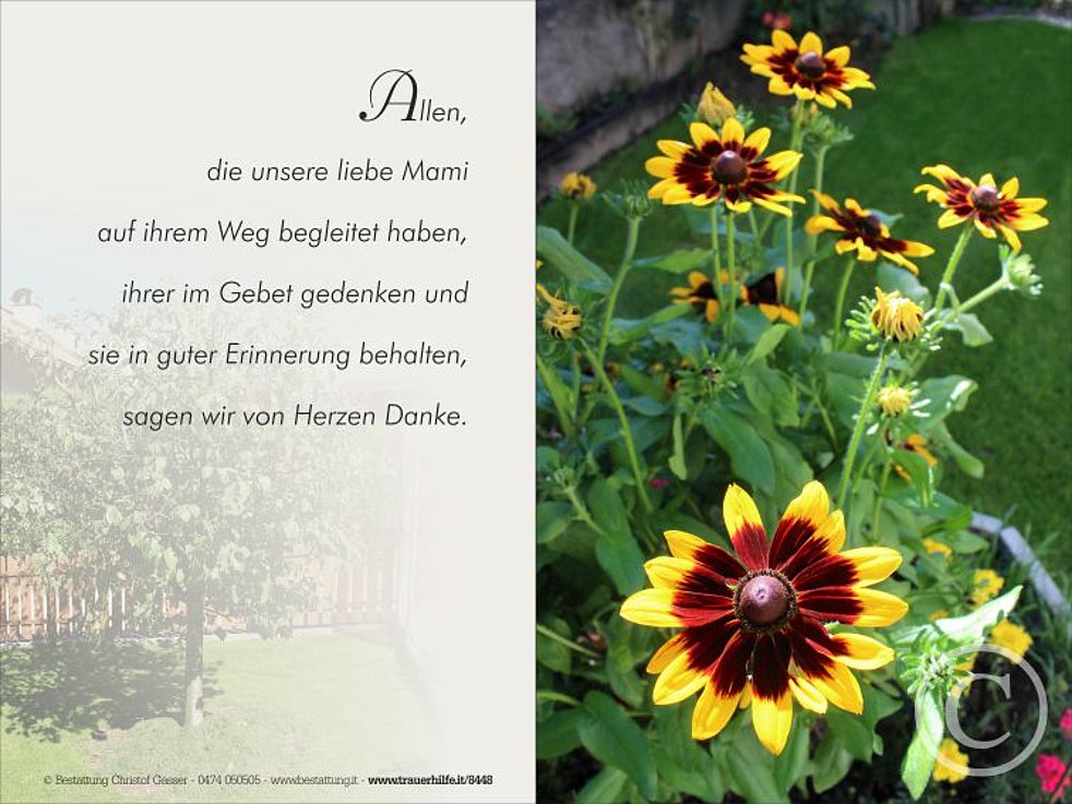 Ein besonderer Dank gilt dem Hausarzt Dr. Martin Kofler sowie den behandelnden Ärzten und dem Pflegepersonal, welche unsere liebe Mami in letzter Zeit so liebevoll begleitet und betreut haben.