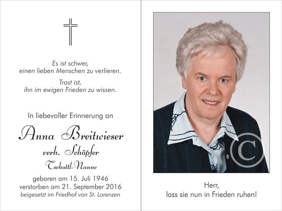 Gemeinsam begleiten wir unsere liebe Mami am Freitag, dem 23. September, von der Friedhofskapelle ausgehend, zum Abschiedsgottesdienst um 14.30 Uhr in die Pfarrkirche von St. Lorenzen und anschließend zur letzten Ruhe in den Friedhof.