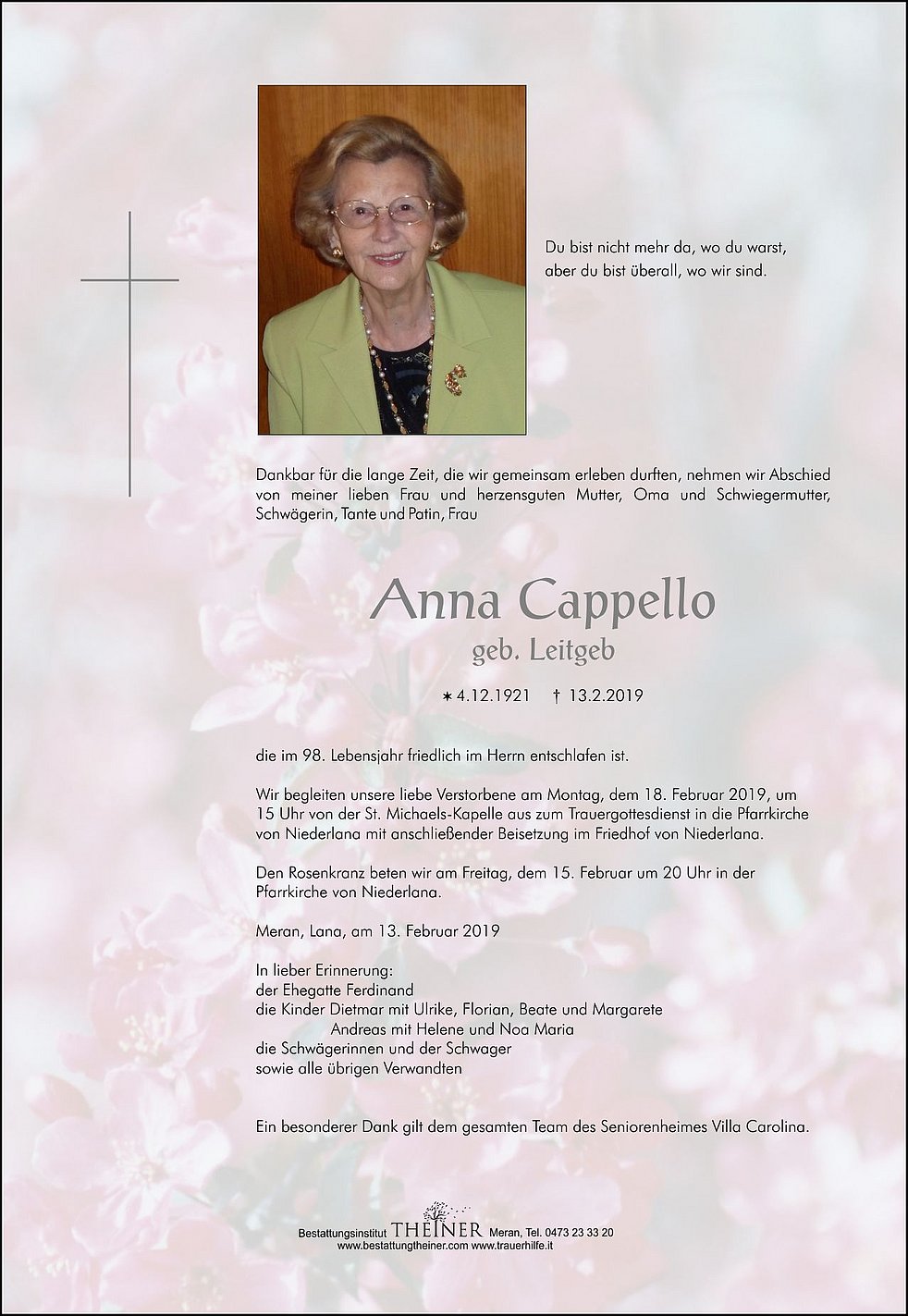 Wir begleiten unsere liebe Verstorbene am Montag, dem 18. Februar 2019, um 15 Uhr von der St. Michaels-Kapelle aus zum Trauergottesdienst in die Pfarrkirche von Niederlana mit anschließender Beisetzung im Friedhof von Niederlana.