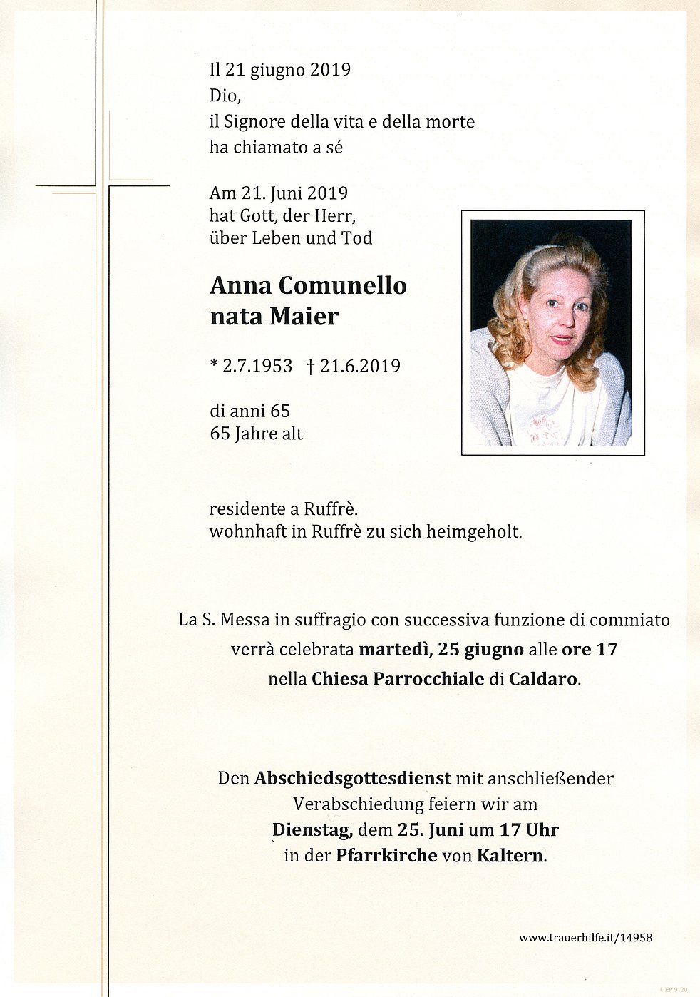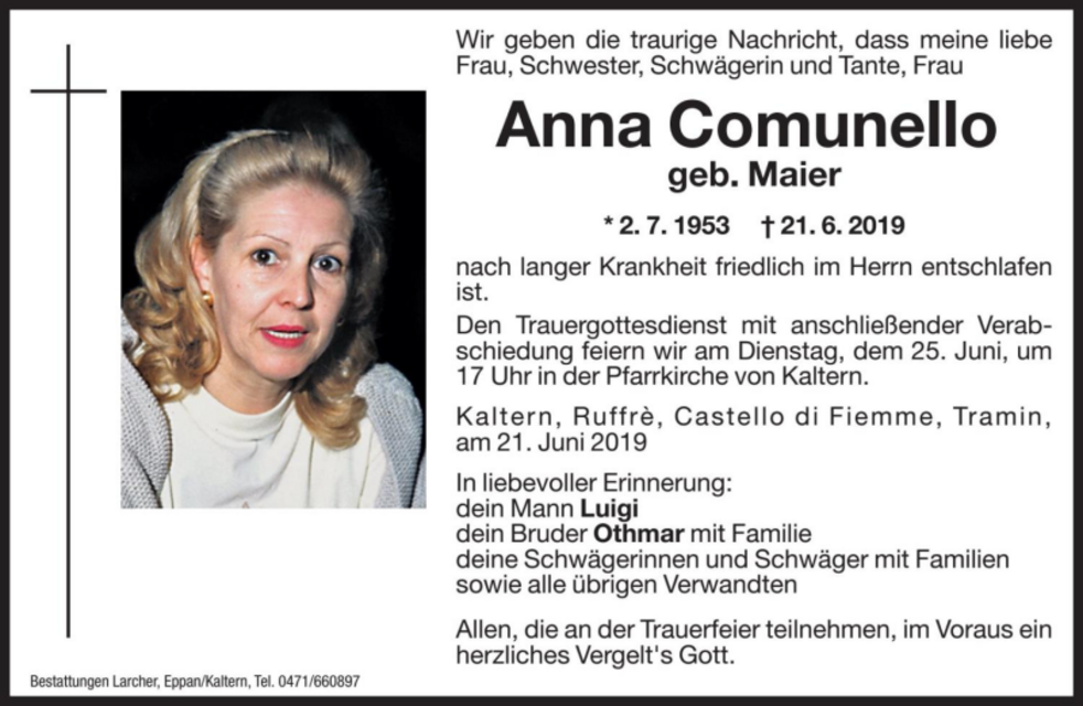 Den Trauergottesdienst mit anschließender Verabschiedung feiern wir am Dienstag, dem 25. Juni um 17 Uhr in der Pfarrkirche von Kaltern.