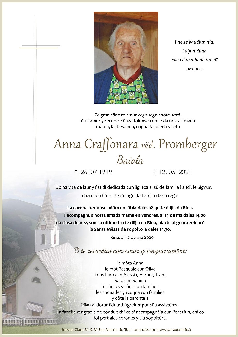 Nach einem erfüllten Leben in fürsorglicher Liebe für die Familie, hat Gott sie im Alter von 101 Jahren zu sich gerufen. Möge sie sanft in Gottes Händen ruhen.