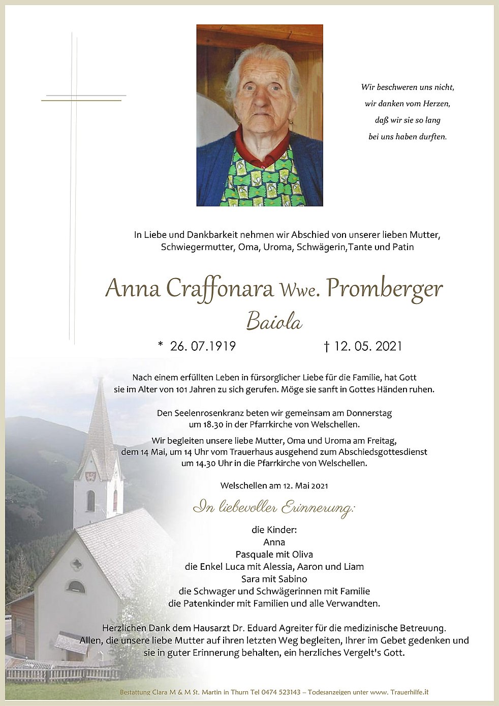 Wir begleiten unsere liebe Mutter, Oma und Uroma am Freitag, dem 14 Mai, um 14 Uhr vom Trauerhaus ausgehend zum Abschiedsgottesdienst um 14.30 Uhr in die Pfarrkirche von Welschellen.