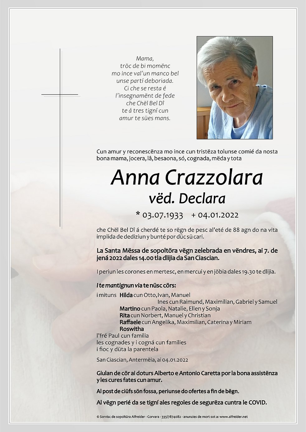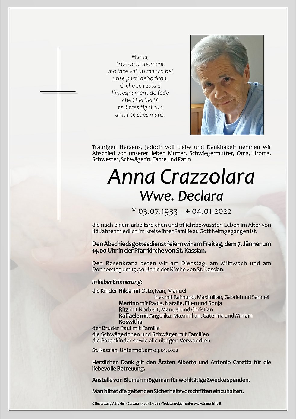 Den Abschiedsgottesdienst feiern wir am Freitag, dem 7. Jänner um 14.00 Uhr in der Pfarrkirche von St. Kassian.