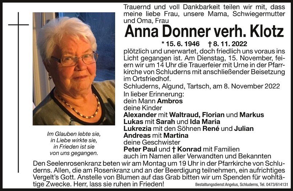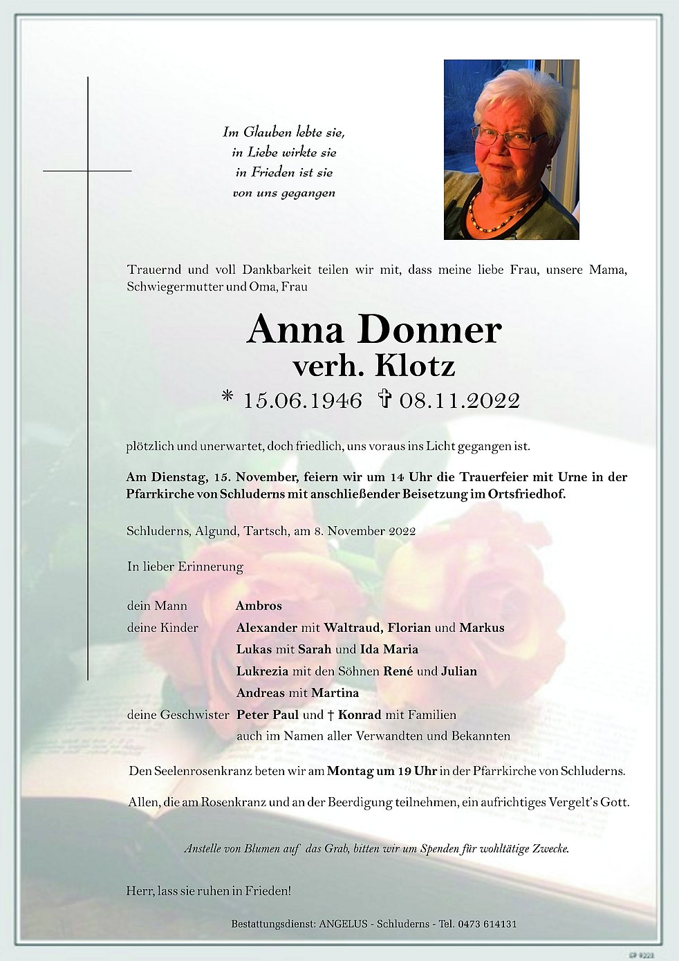 Ganz still und leise ohne ein Wort gingt's du liebe Anna von deinen Liebsten fort Aufrichtige Anteilname Anna Ruhe in Frieden i wear di olm in guater Errinnerung beholtn du wearsch ins olle fahln