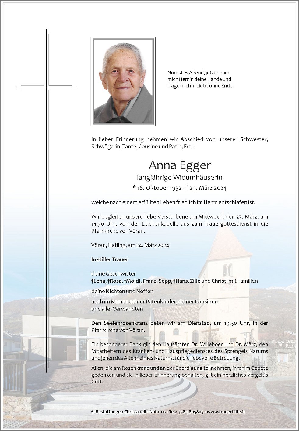 Wir begleiten unsere liebe Verstorbene am Mittwoch, den 27. März, um 14.30 Uhr, von der Leichenkapelle aus zum Trauergottesdienst in die Pfarrkirche von Vöran.
